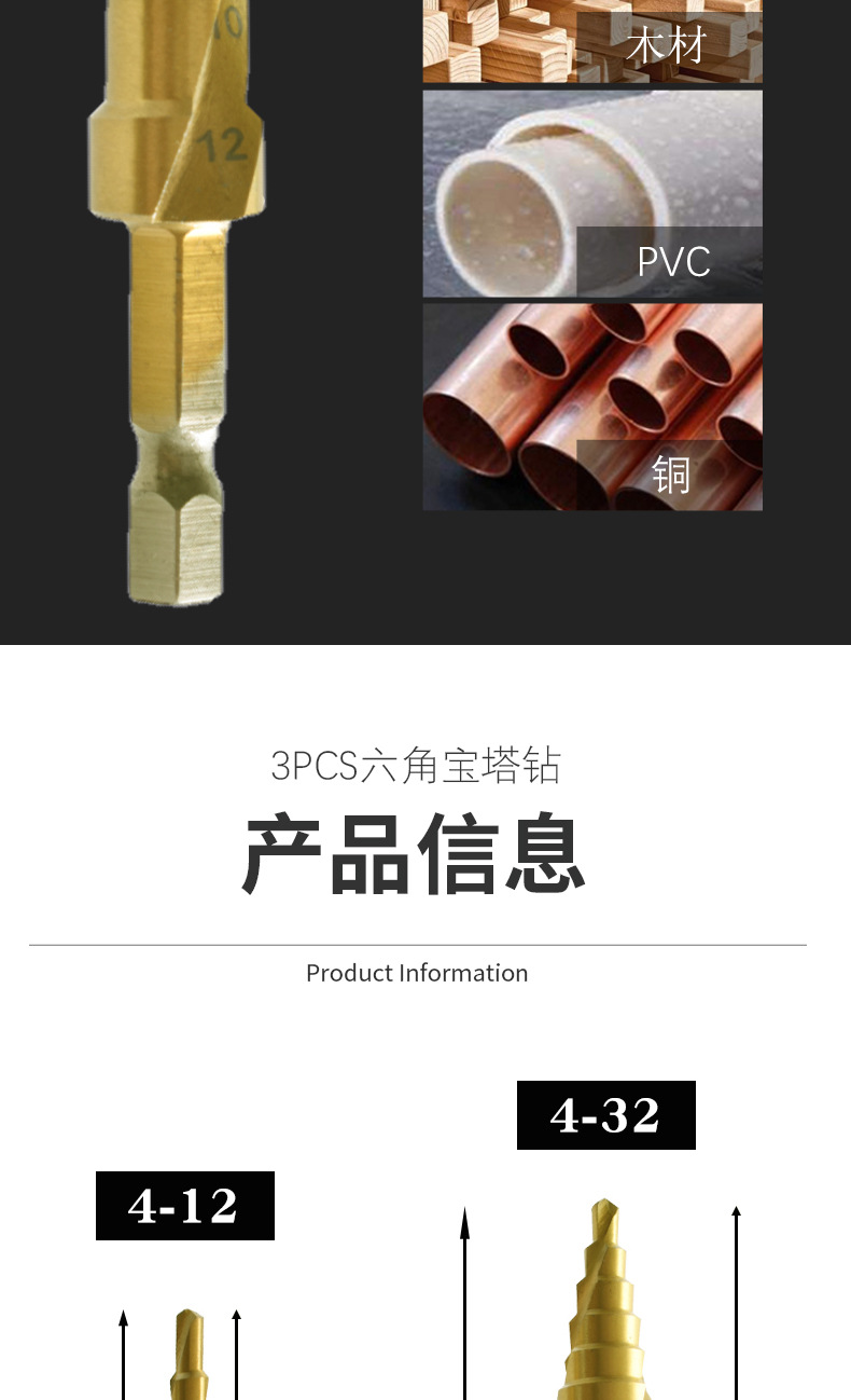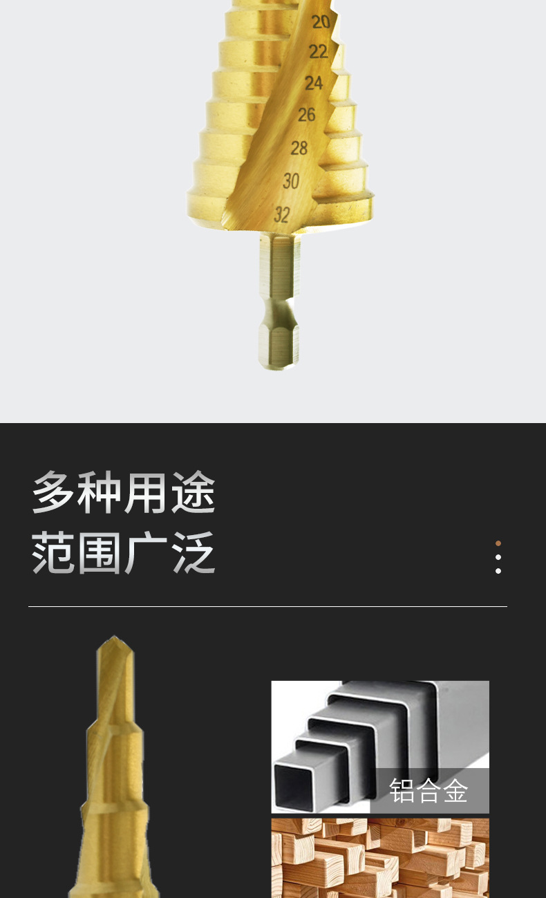 六角柄螺旋宝塔钻高速钢扩孔台阶钻头手电钻打孔工具套装阶梯钻头