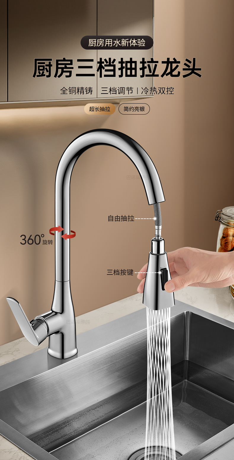 【太空银】全铜三档抽拉◆万向旋转◆防溅水(质保20年)