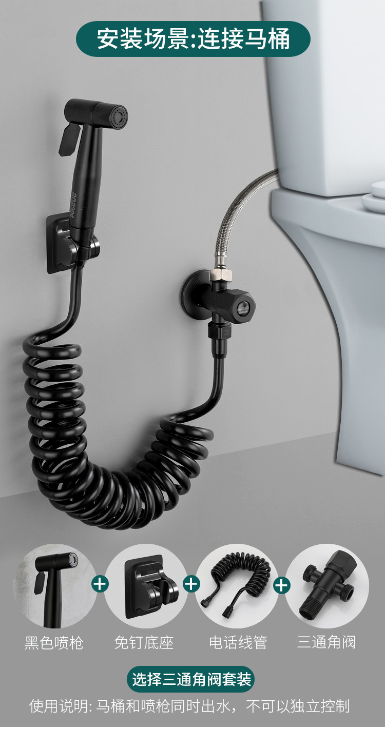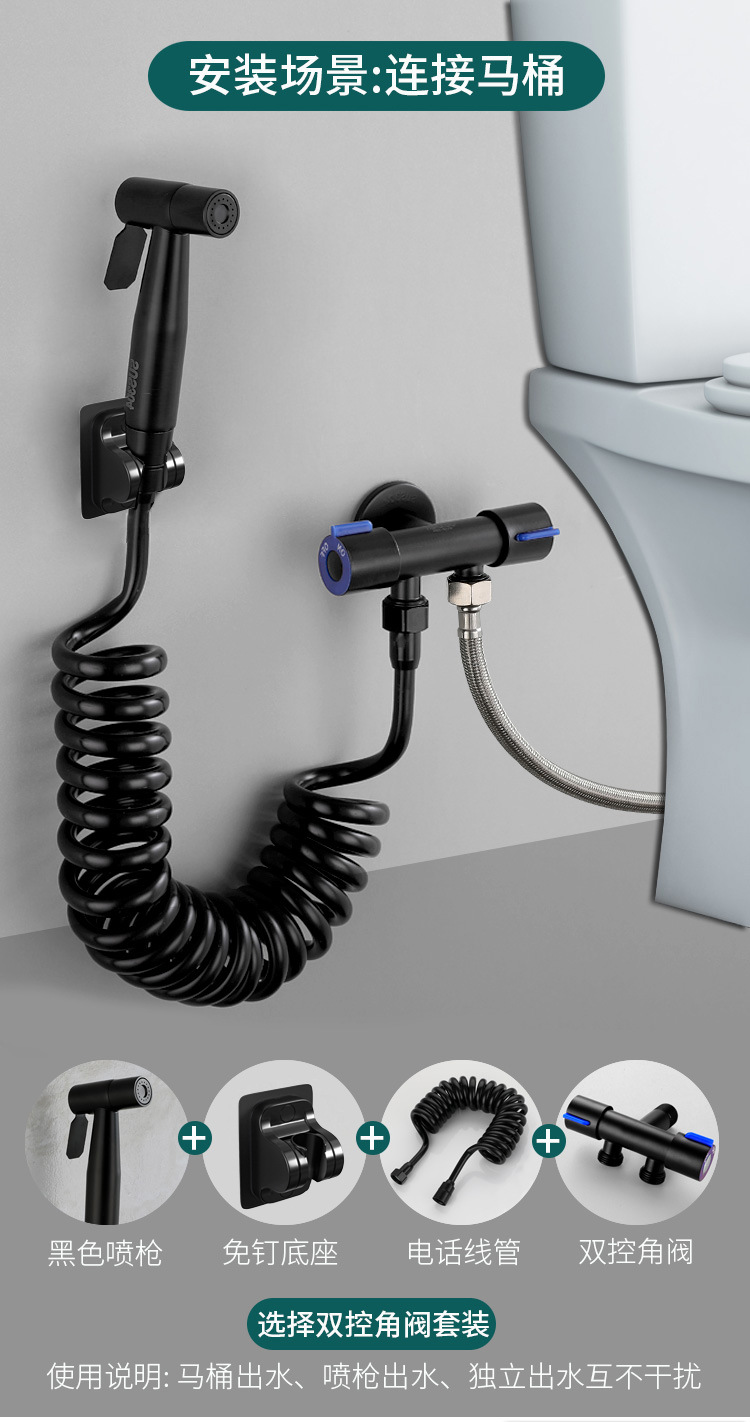 - 不锈钢黑色双用六角轮角阀+304黑色喷枪+黑色黏贴元宝座+3米黑PU电话淋浴管