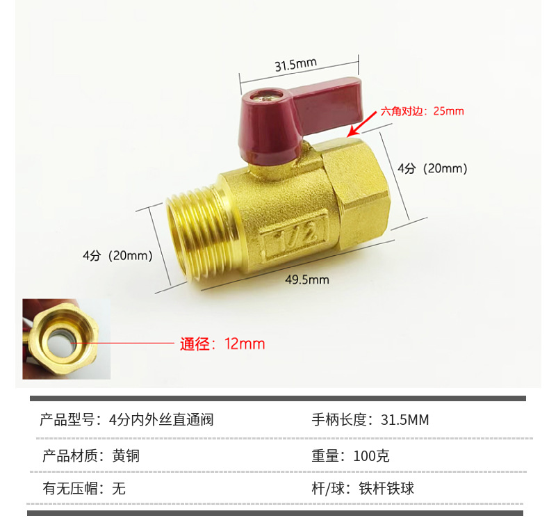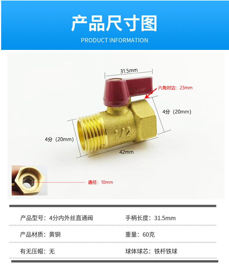 迷你小球阀4分内外丝直通式铜球阀空压机净水器阀门热水器球阀门