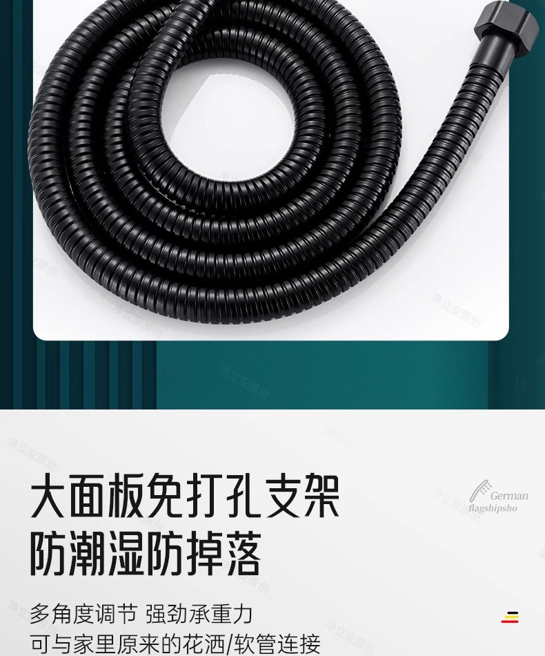 - 【典雅黑套装5】增压花洒+2.0米防爆软管+免打孔支架