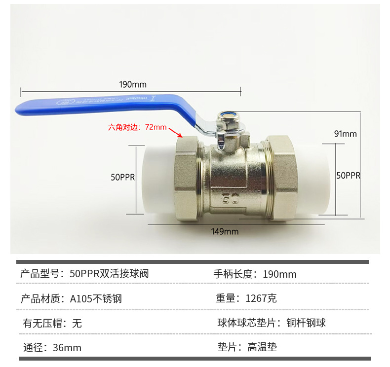 不锈钢锻钢50PPR双活接球阀