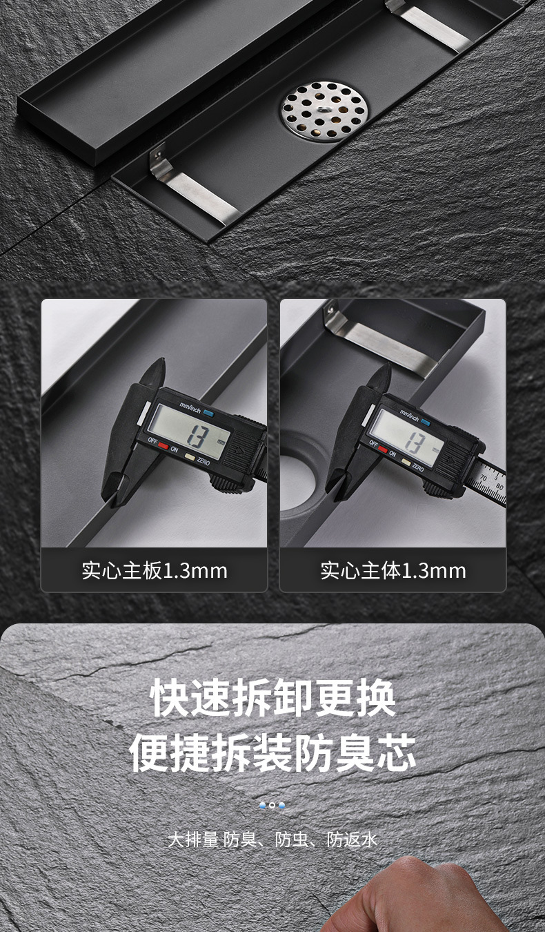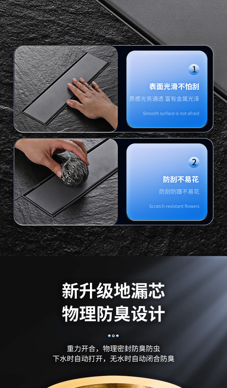 304不锈钢枪灰隐形地漏长条形下水道淋浴房卫生间防臭隐藏式长款