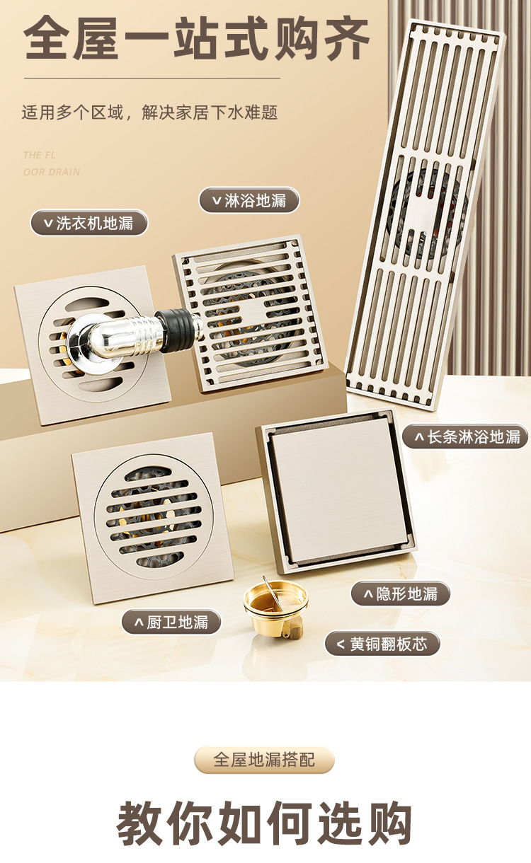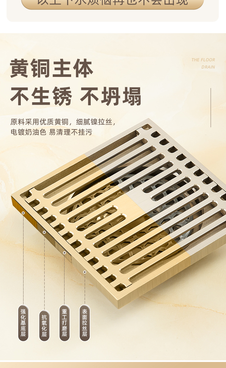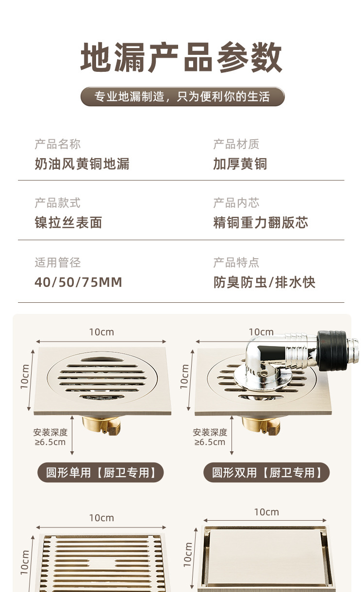 奶油风铜拉丝防虫臭地漏家用厨房淋浴室阳台下水道洗衣机大排量