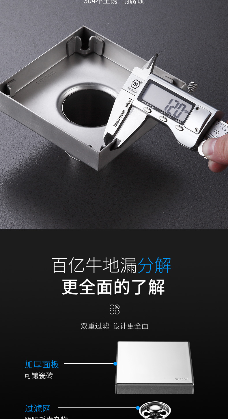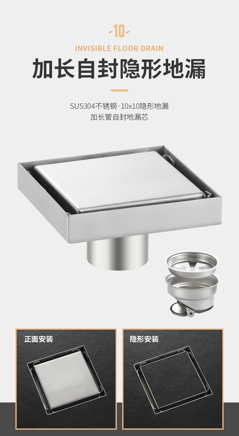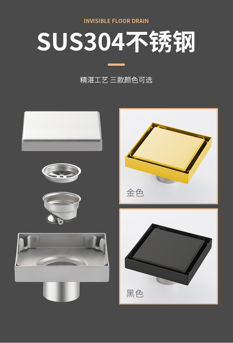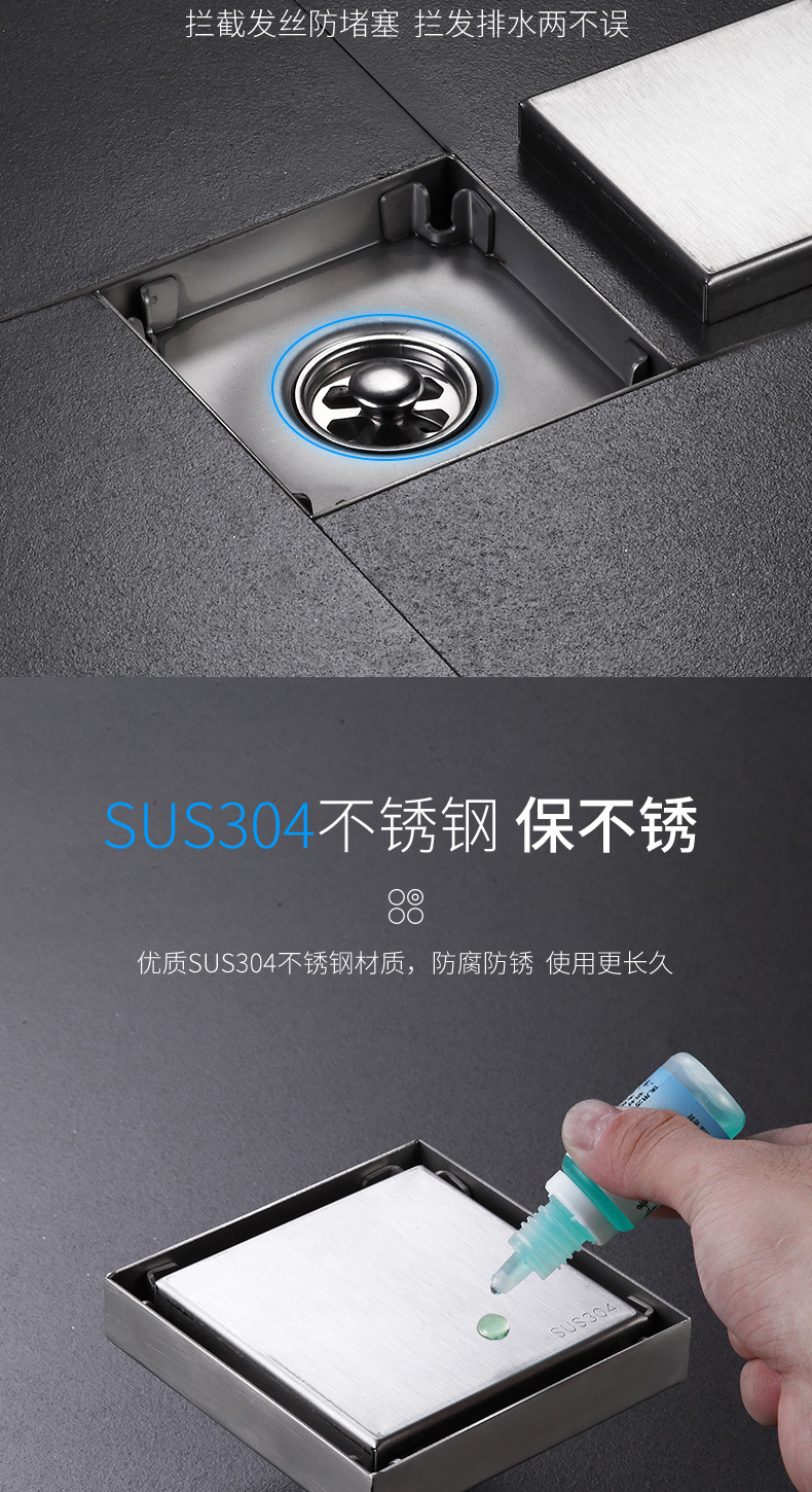 卫生间可镶瓷砖隐藏地漏方形地漏不锈钢304工程酒干区隐形防臭