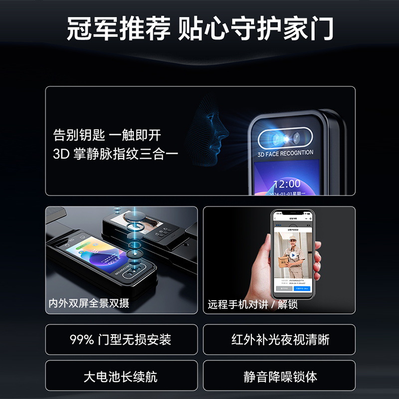 - 大霸王锁体-可视对讲-包安装-静音降噪(掌静脉+3D人脸+远程开锁+可视猫眼+指纹)