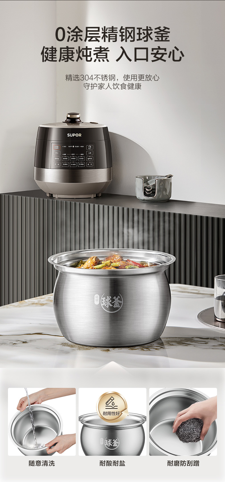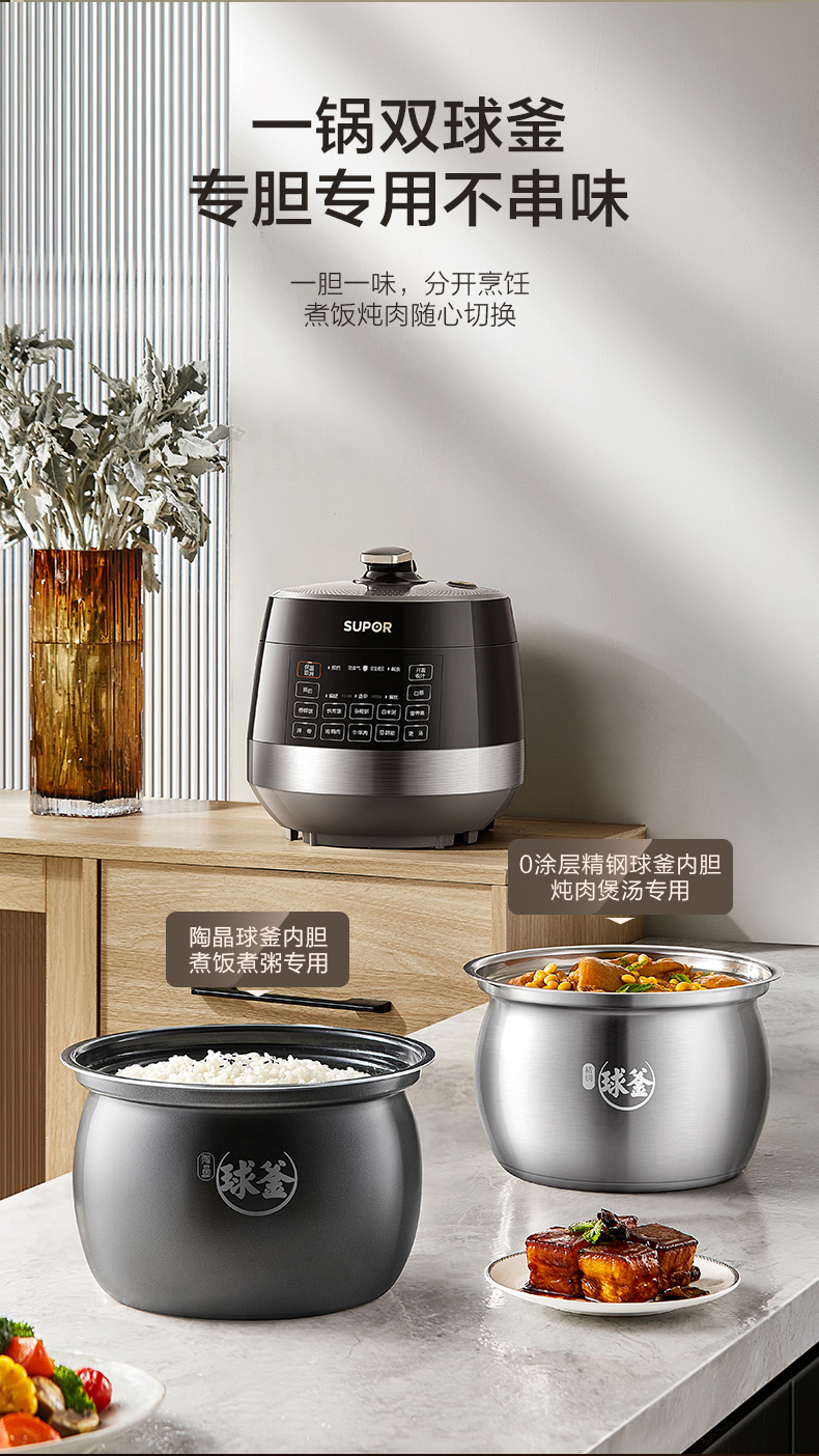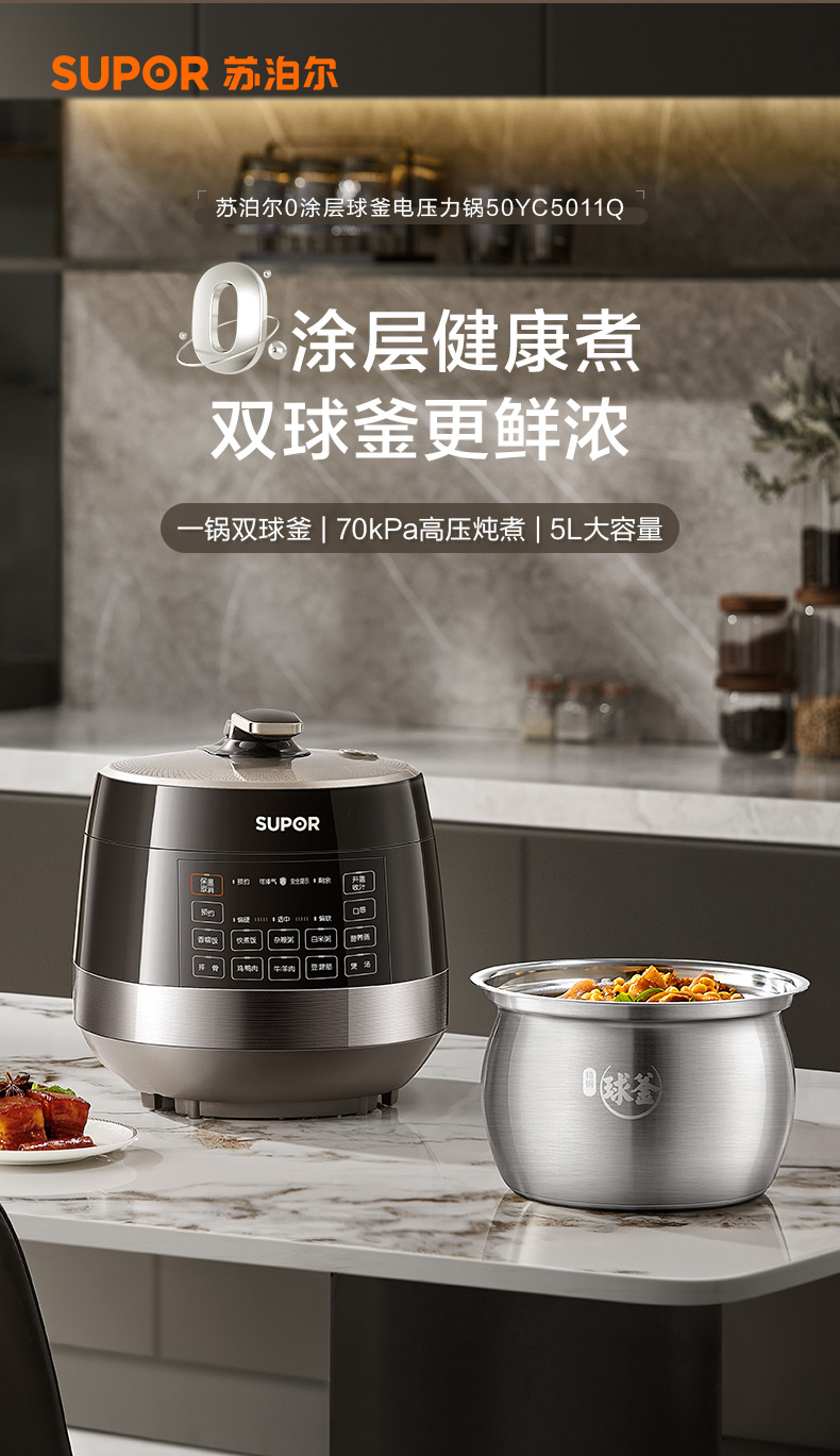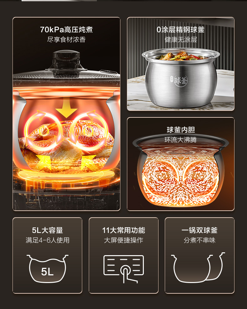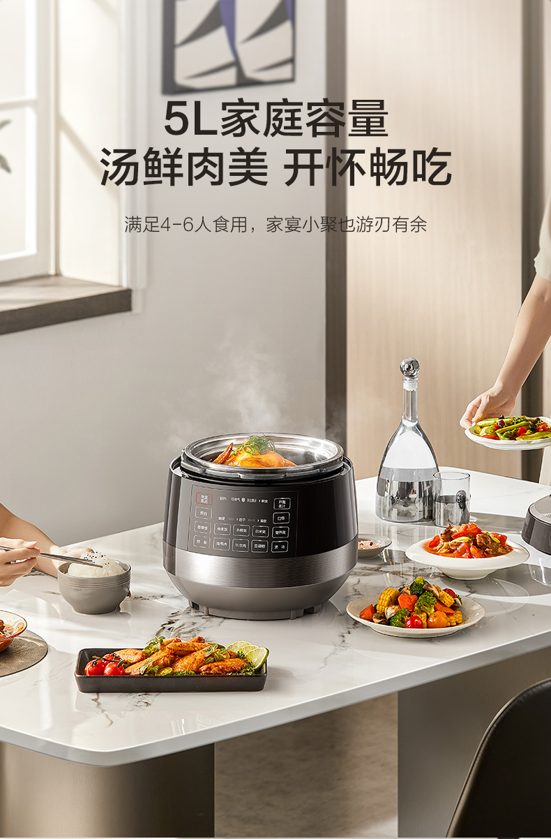电压力锅家用5升大容量无涂层不锈钢深锅球釜双胆高压电饭