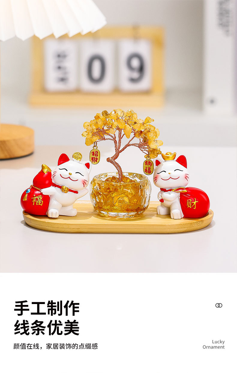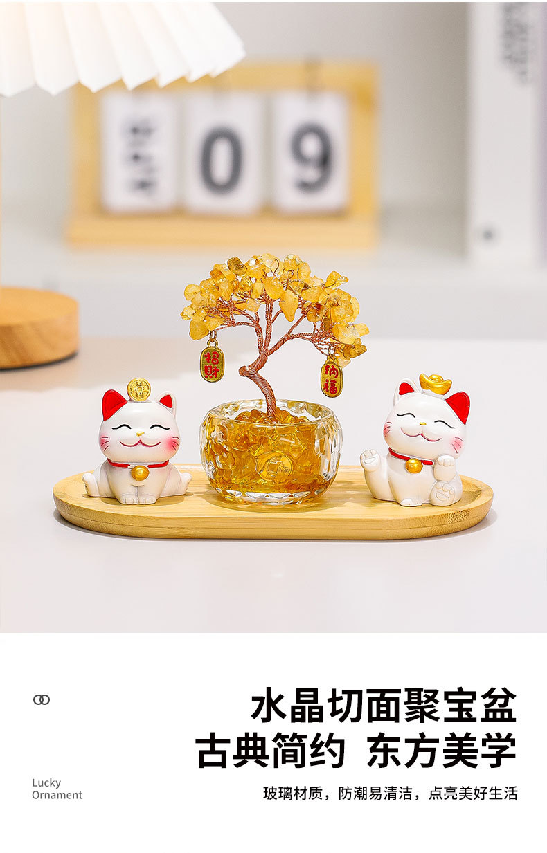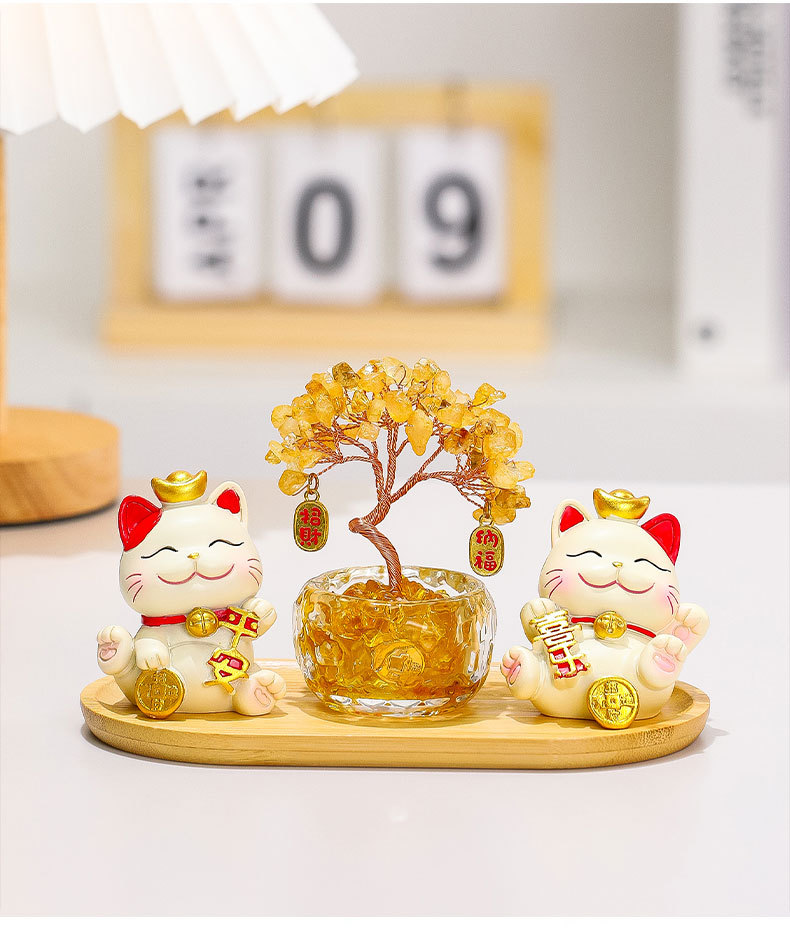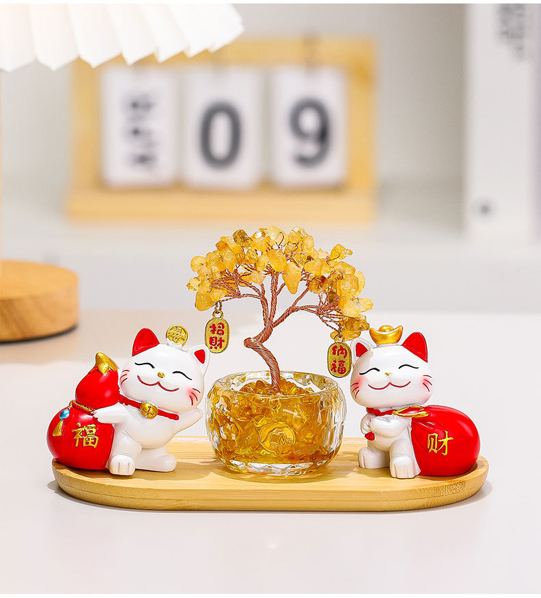 幸运猫+招财猫+水晶发财树+竹木托盘
