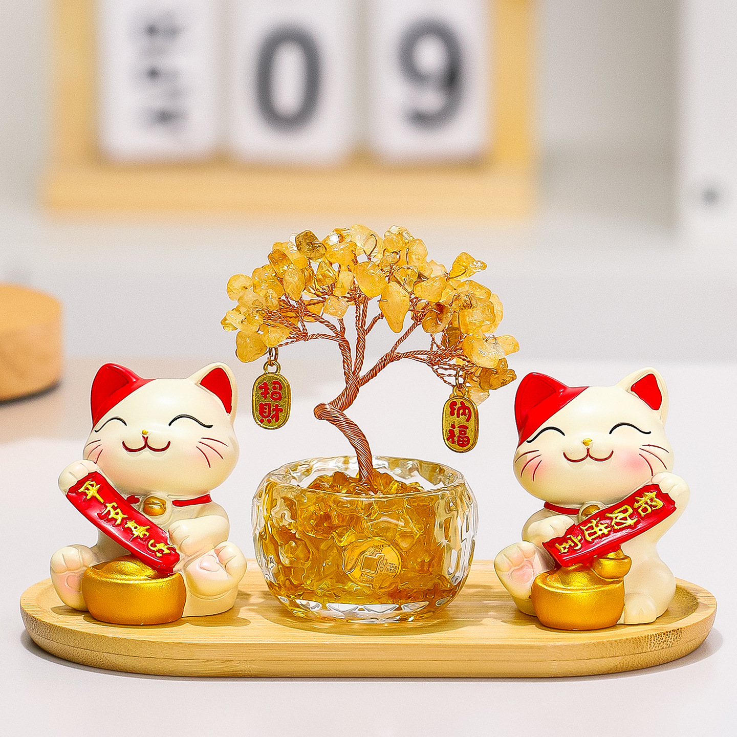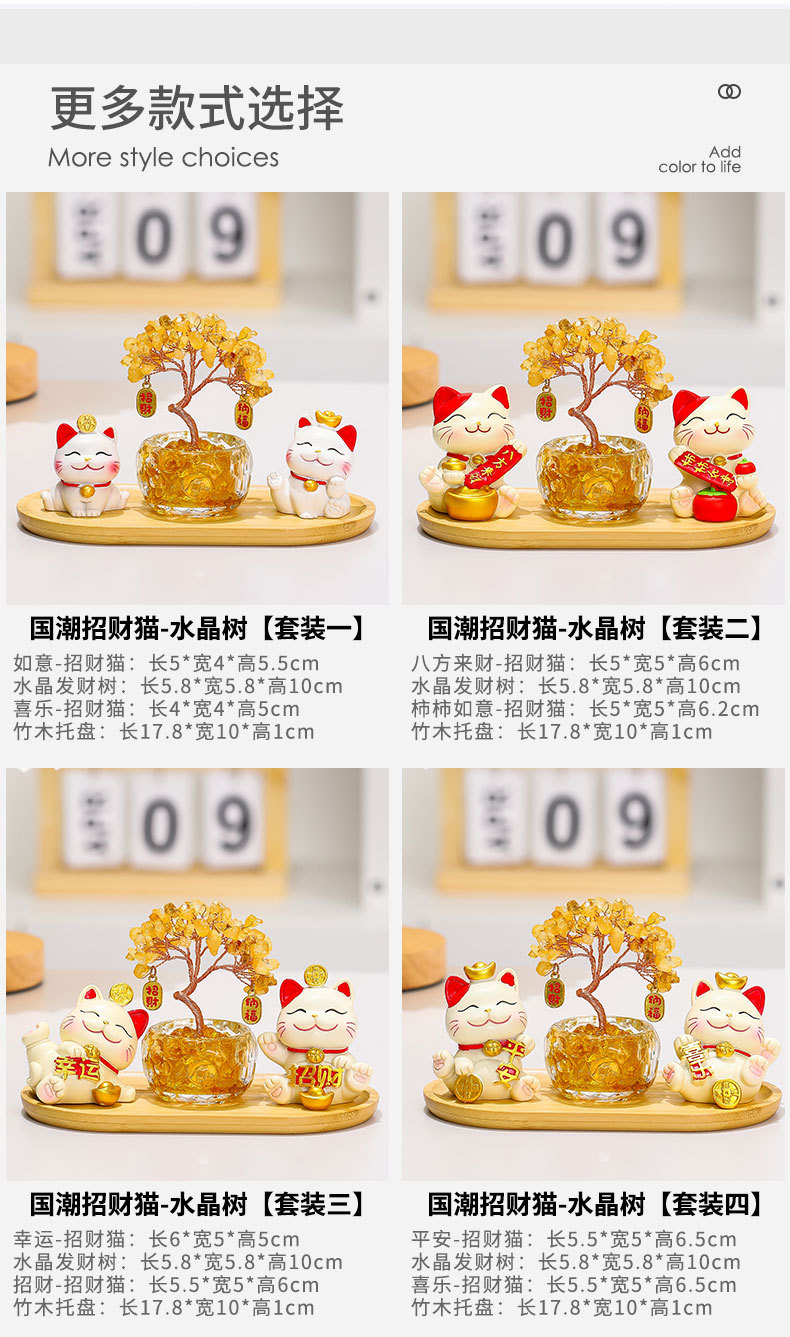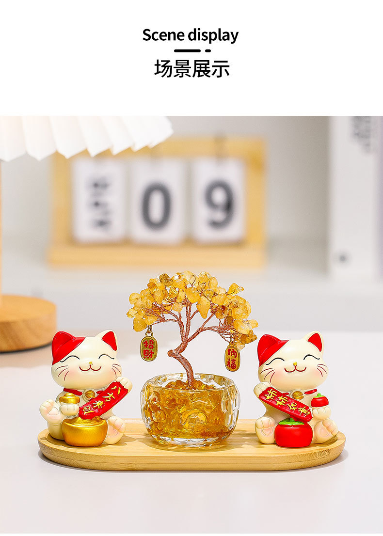 幸运猫+招财猫+水晶发财树+竹木托盘