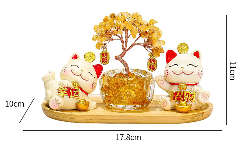 平安猫+喜乐猫+水晶发财树+竹木托盘