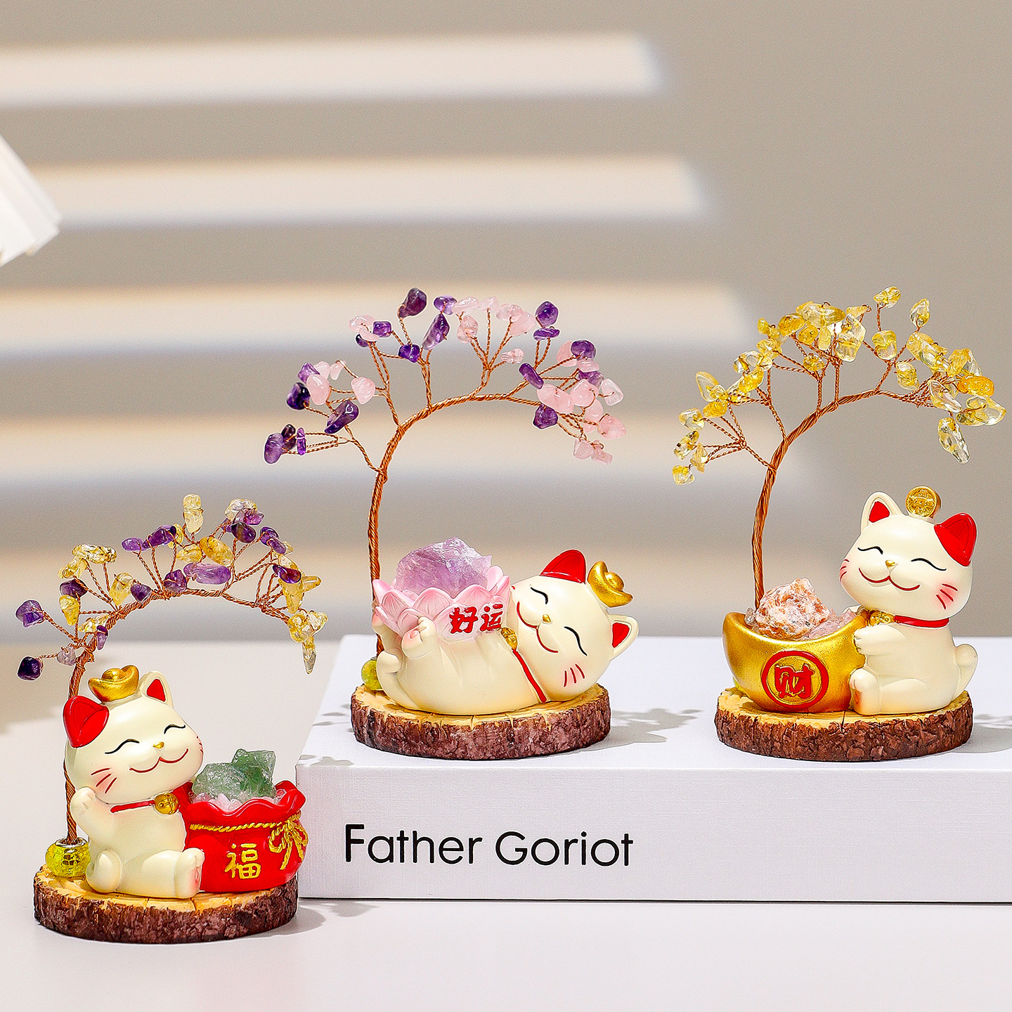 新款招财猫天然水晶发财树家居客厅摆件可爱小猫办公室桌面装饰品