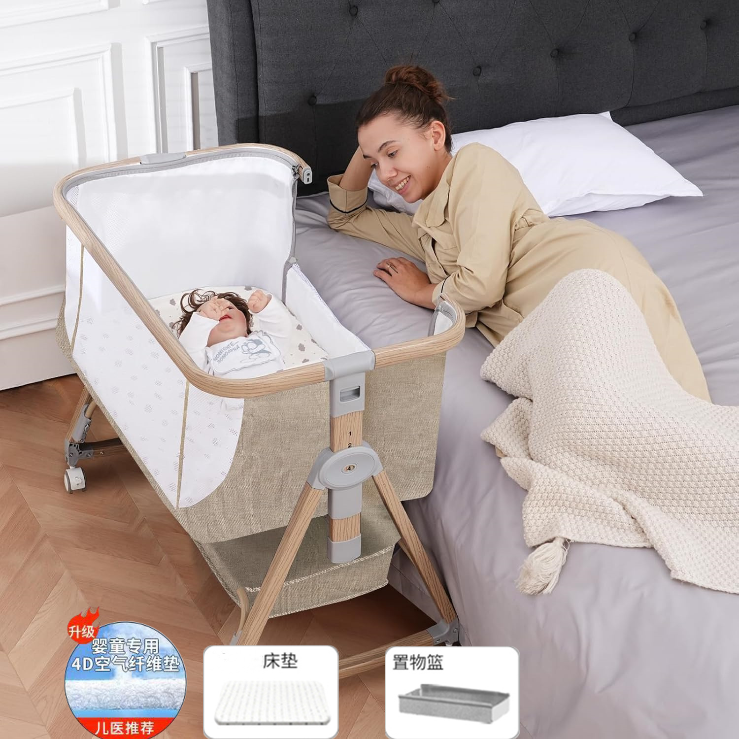 - 铝合金浅木纹卡其+4D高科技床垫+储物篮
