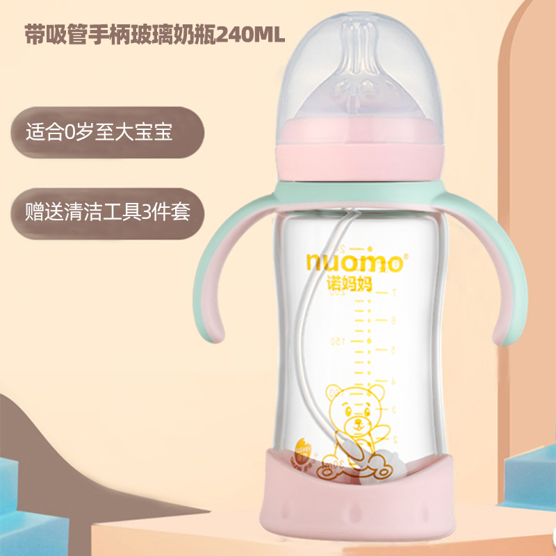 诺妈妈新生婴儿大宝宝玻璃奶瓶240mL防胀气宽口径带手柄吸管耐摔
