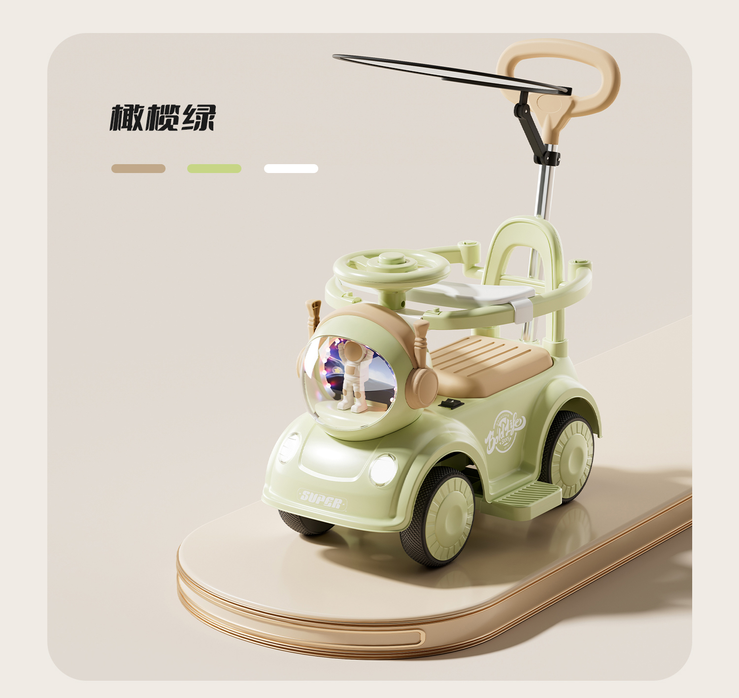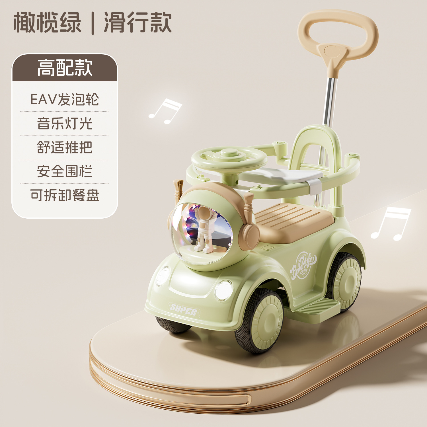 - 橄榄绿【经典滑行款】音乐灯光+推把围栏+餐盘+普通轮+非电动电力驱动