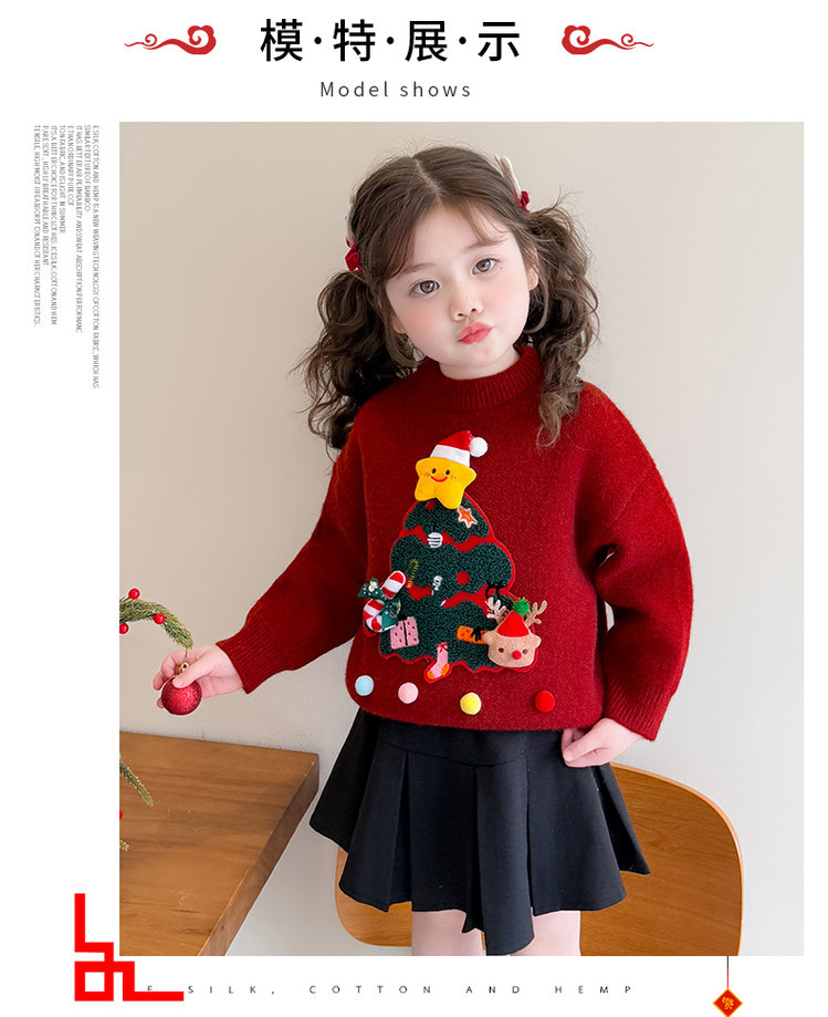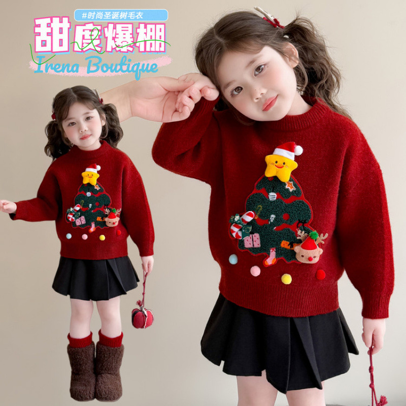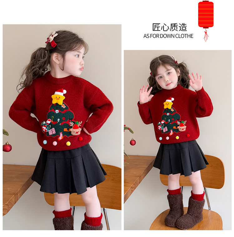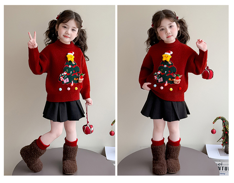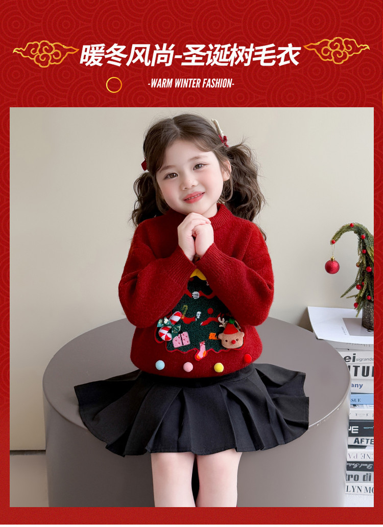 女童卡通圣诞毛衣冬装2025新款女小童洋气红色针织衫保暖打底上衣