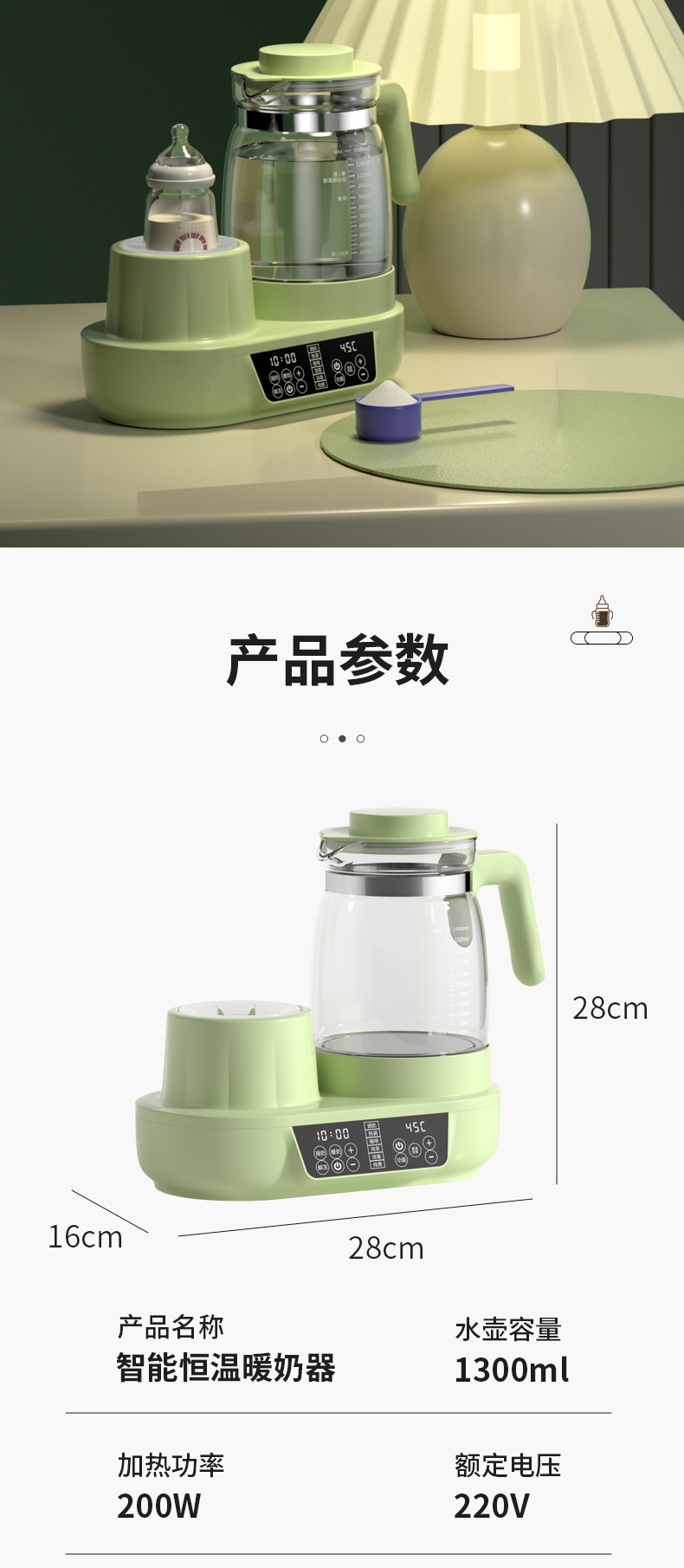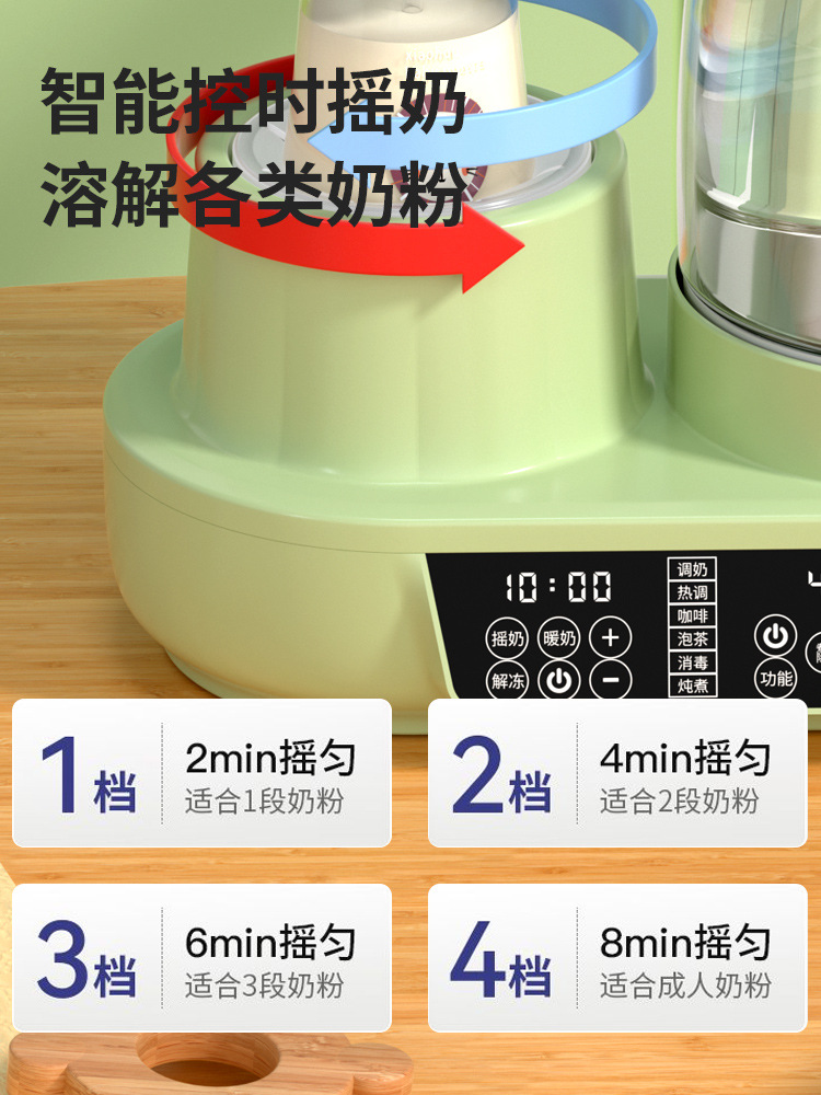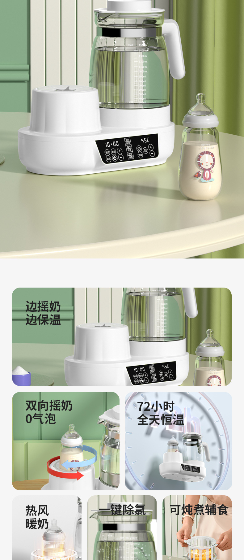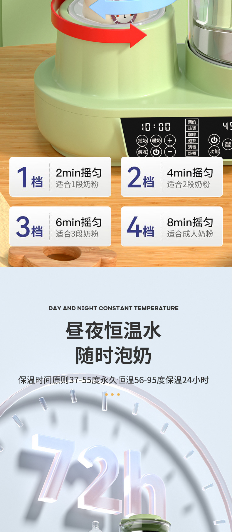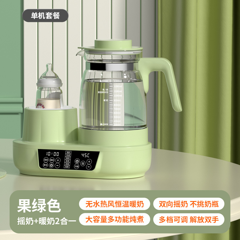- 1200ml果绿色8合1恒温泡奶+摇奶+无水暖奶+炖盅+解冻+消毒烘干
