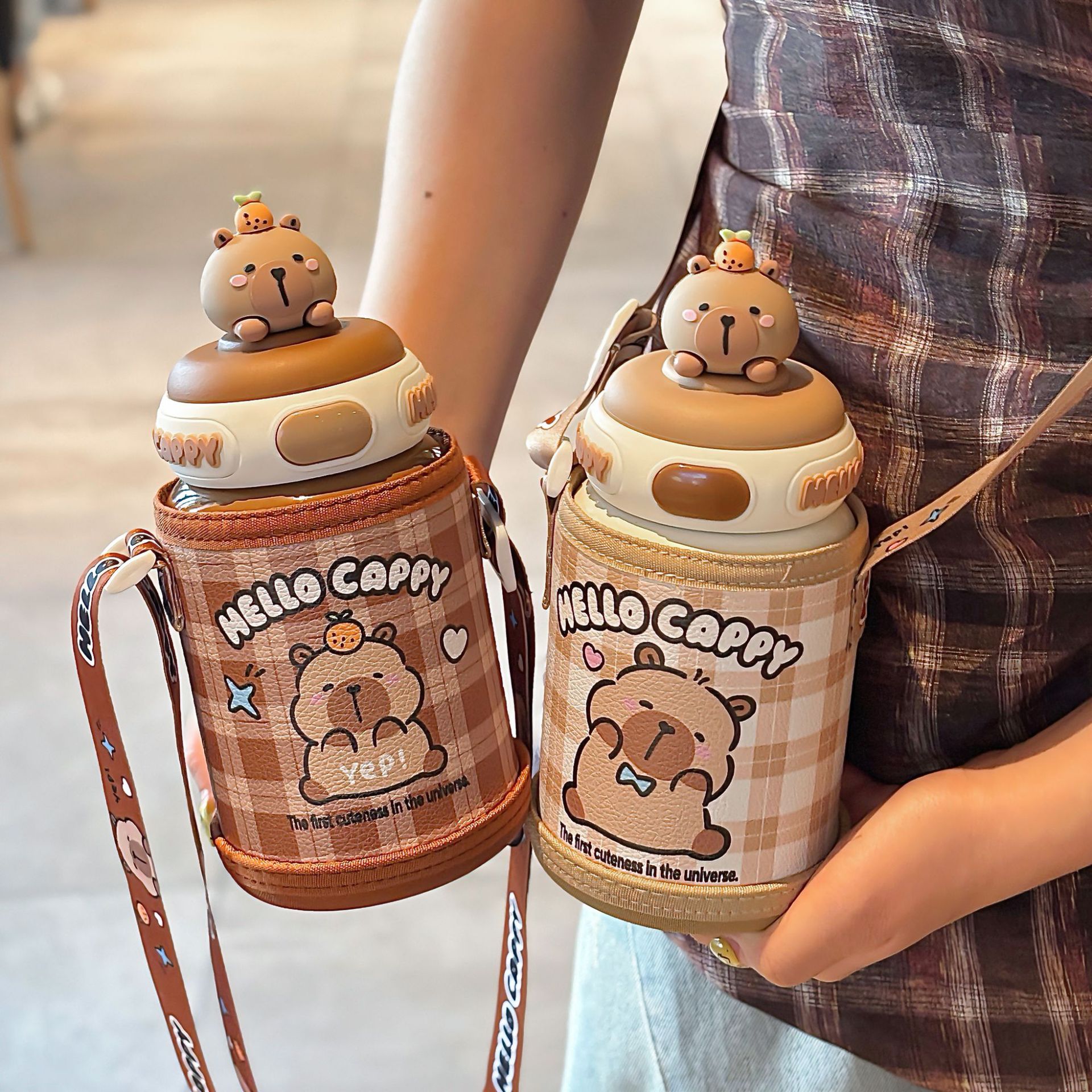可爱卡皮巴拉儿童壶杯套学生保温杯可调节杯绳便携硅胶吸嘴饮水杯