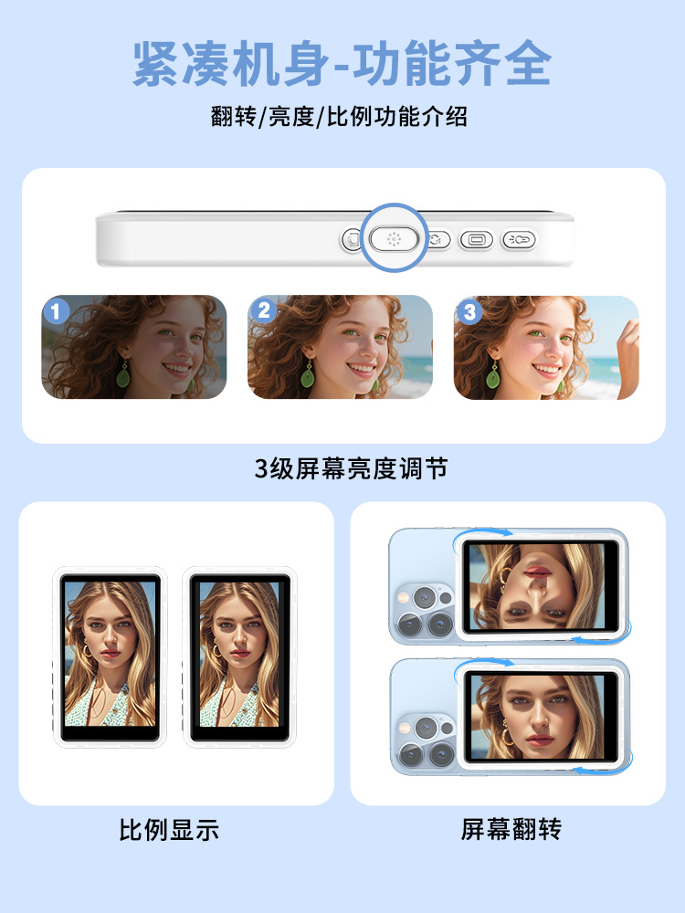 手机同屏器蓝牙磁吸自拍显示屏无线直播补光灯后置监测手机投屏器