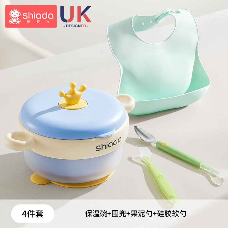 - 【注水碗+围兜+果泥勺+硅胶软勺4件套】感温蓝+绿色饭兜+绿色果泥勺+硅胶软勺