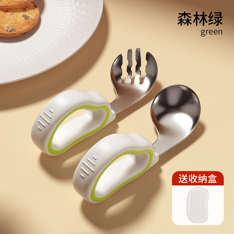 - 【绿色】316不锈钢弯头勺+叉+收纳盒