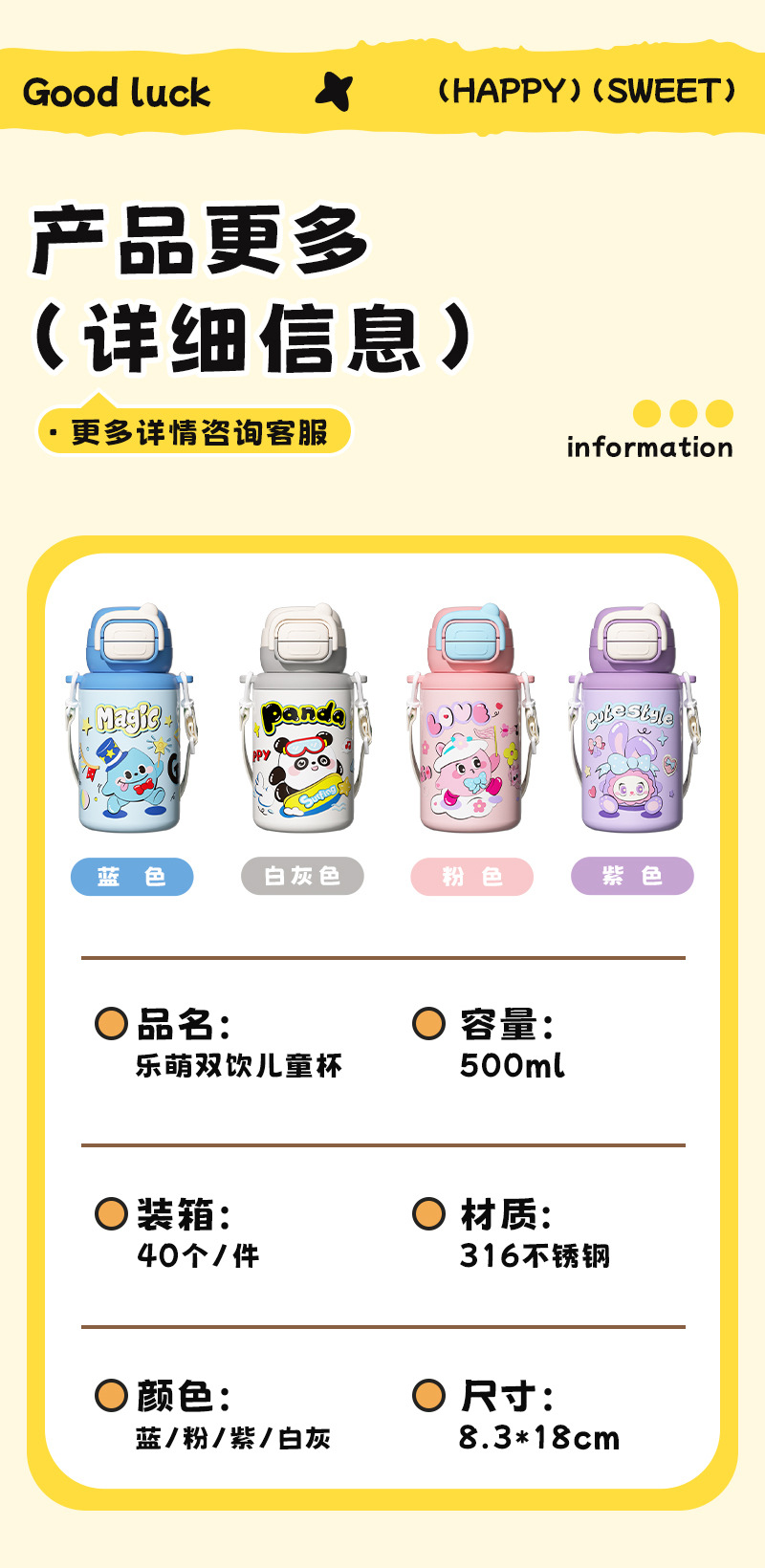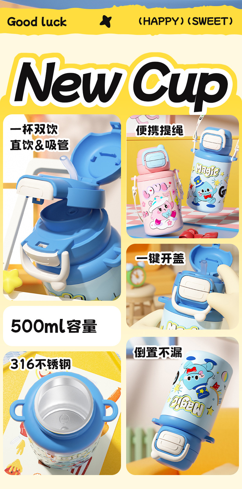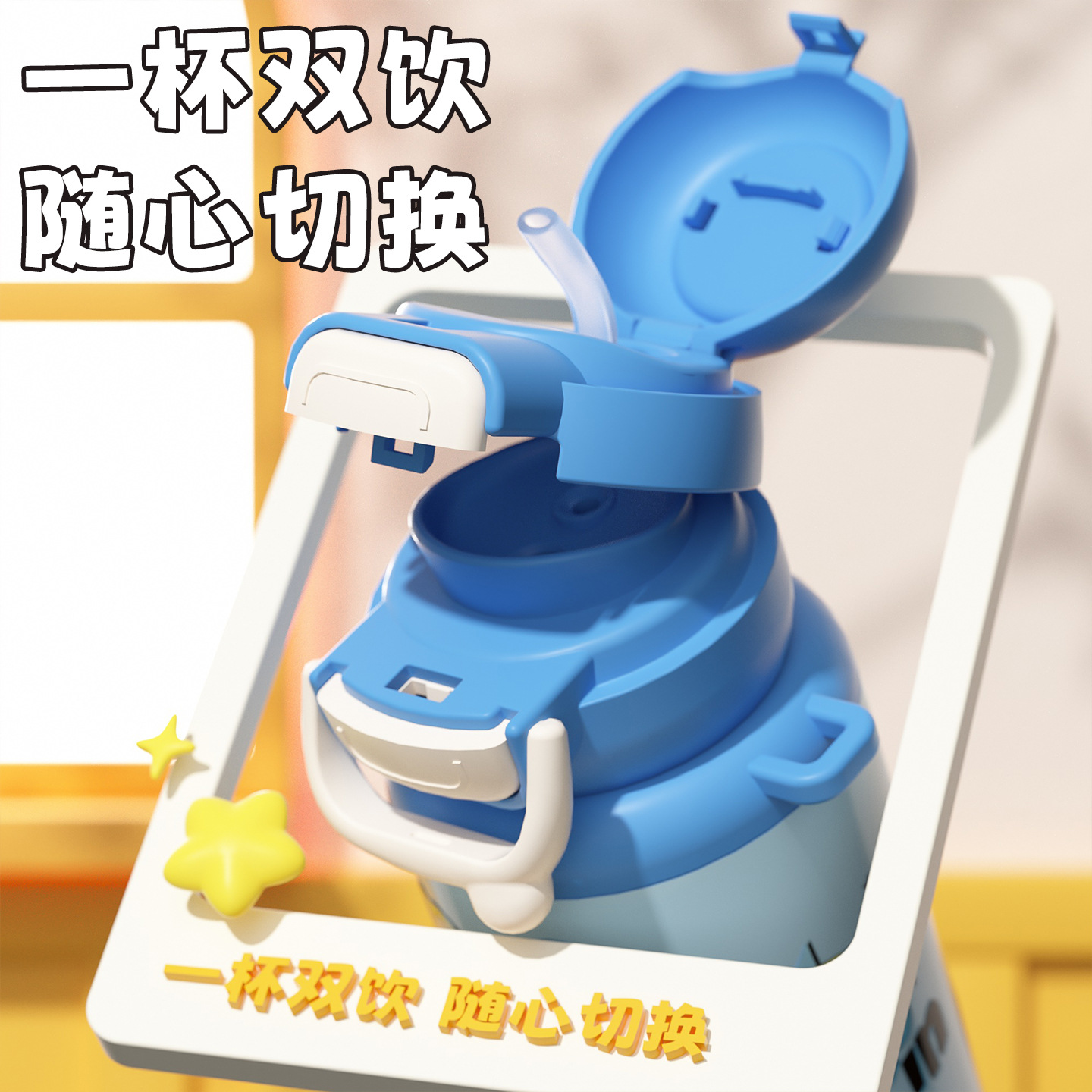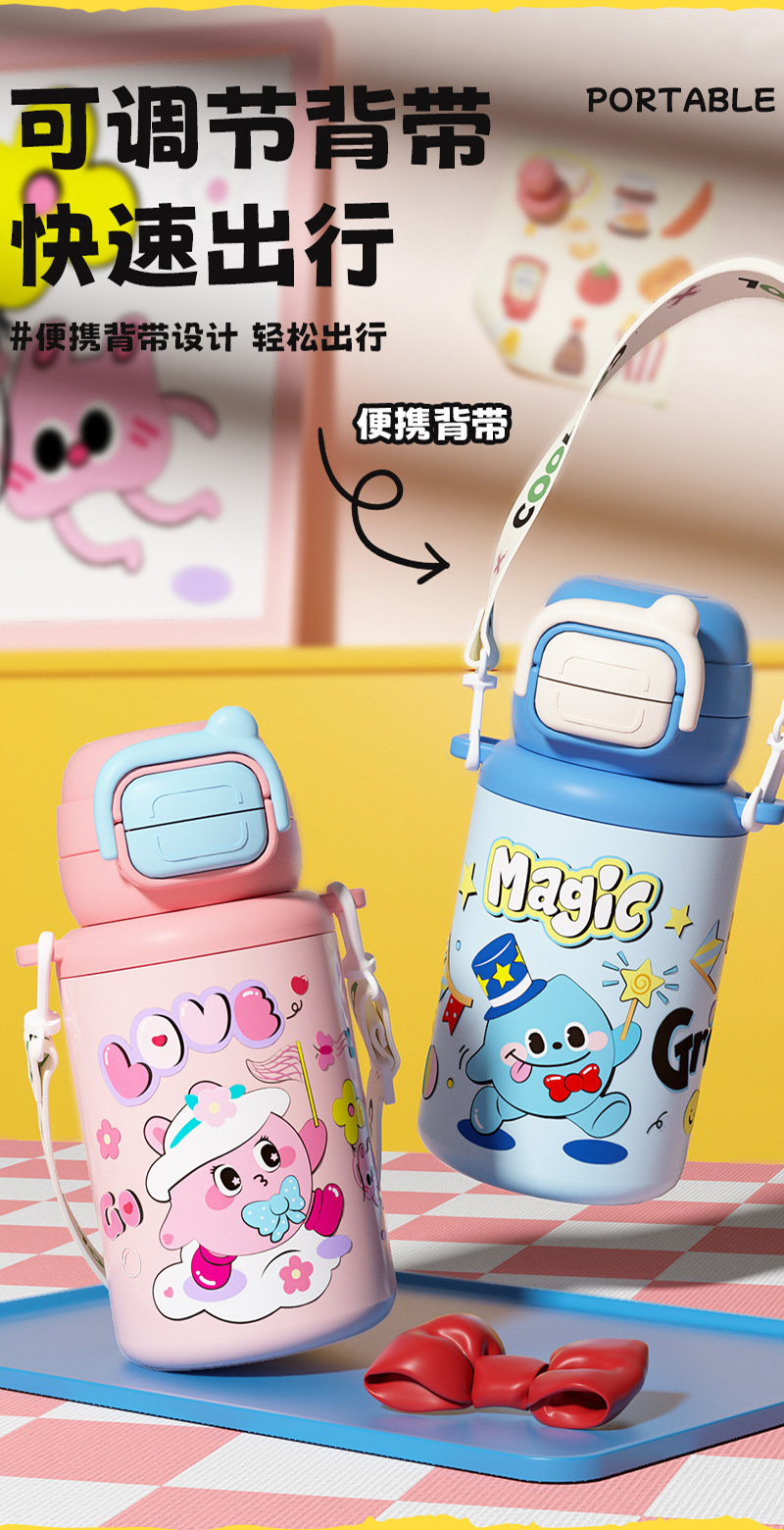 新款双饮儿童保温杯户外大容量运动水壶便携带背带直饮不锈钢水杯