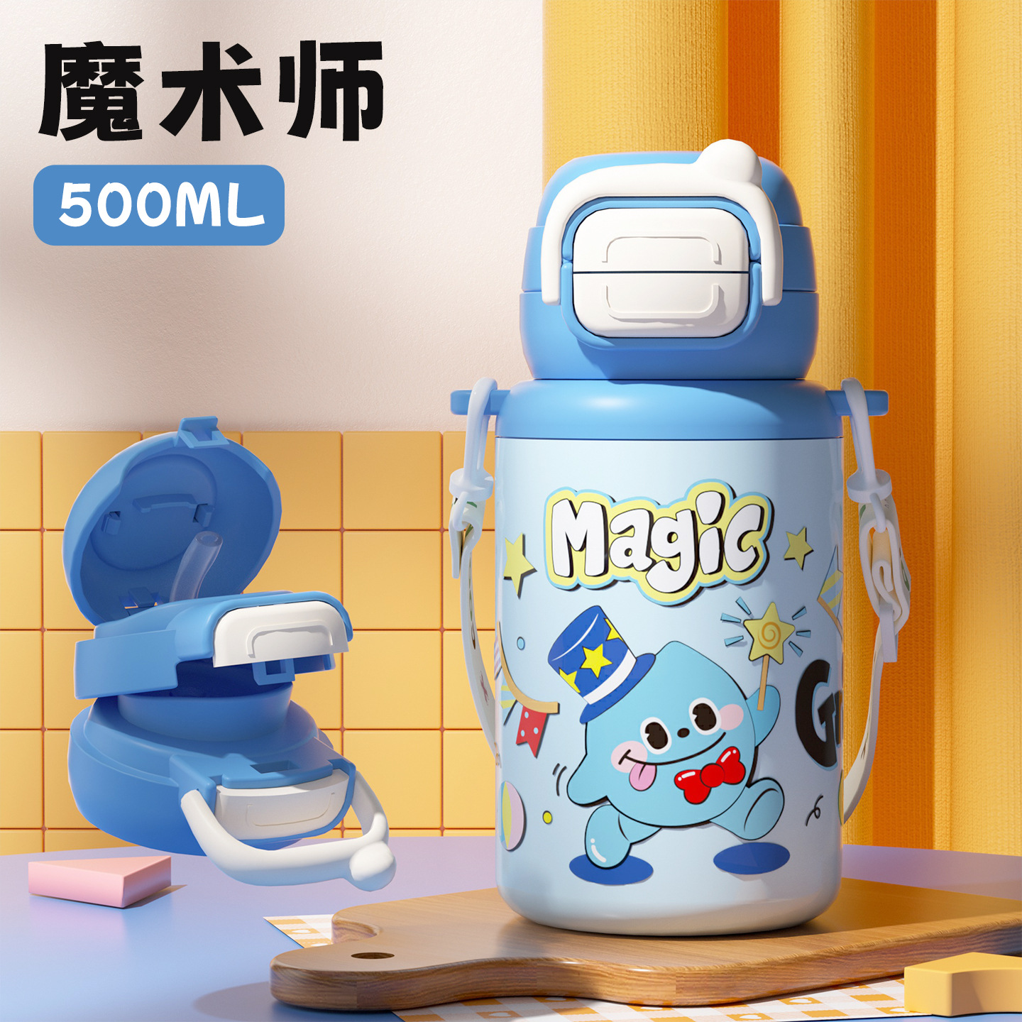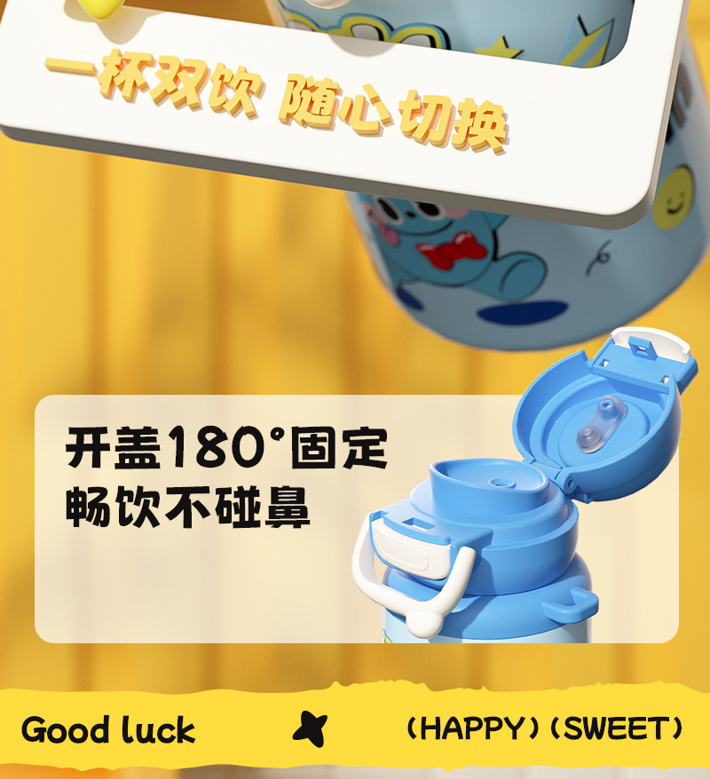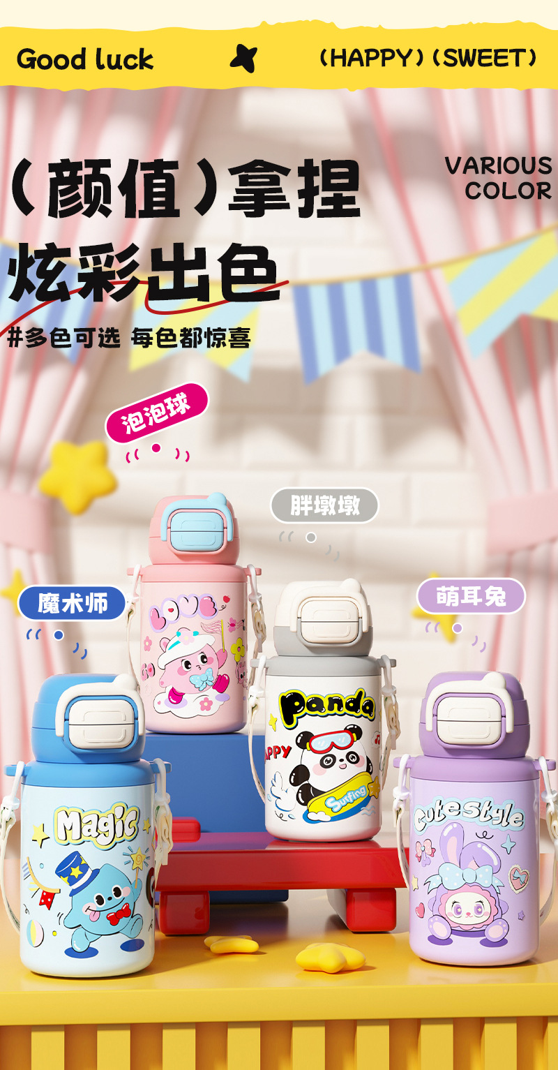 新款双饮儿童保温杯户外大容量运动水壶便携带背带直饮不锈钢水杯