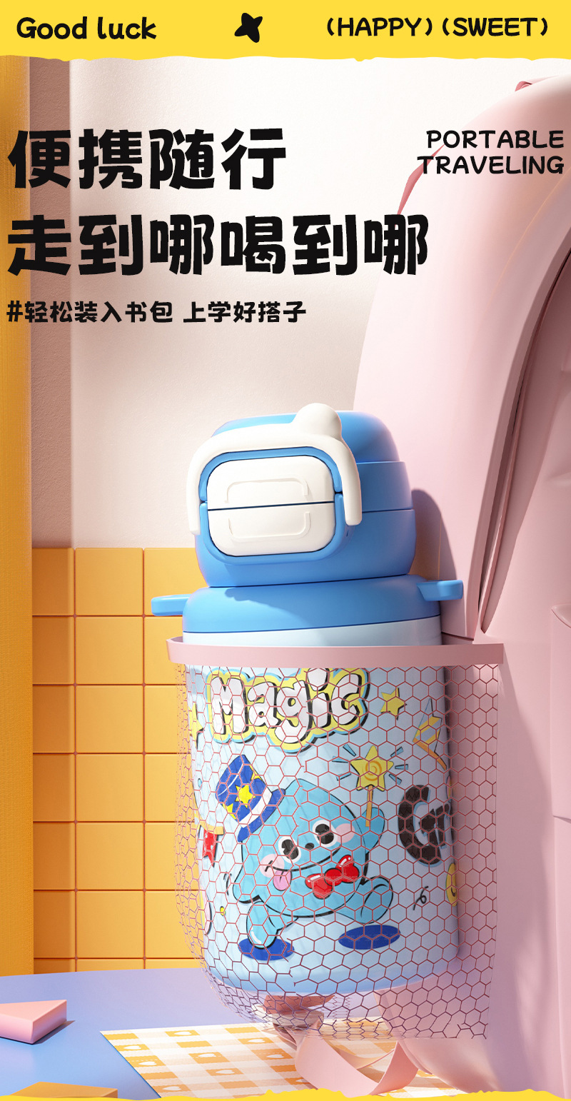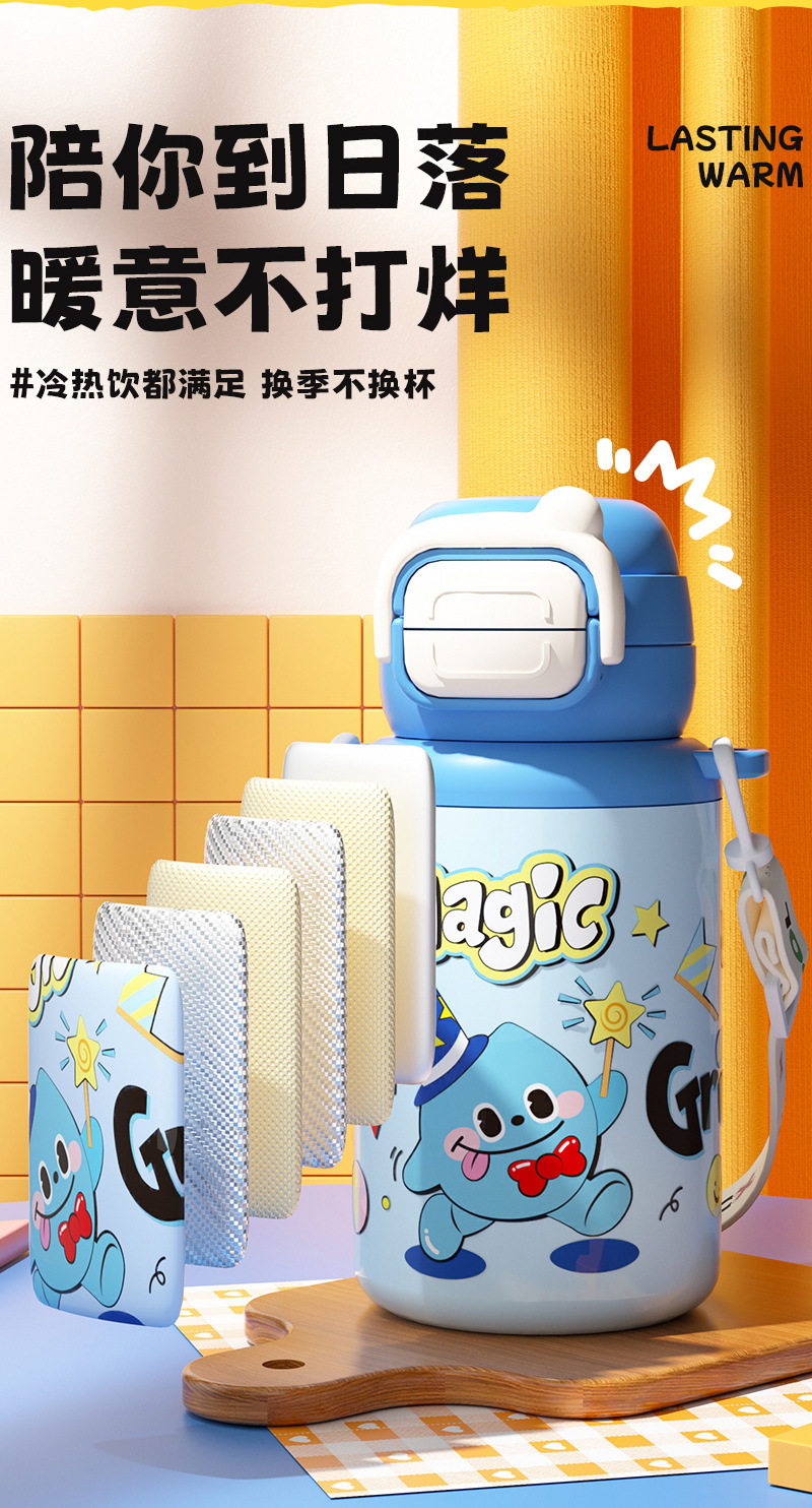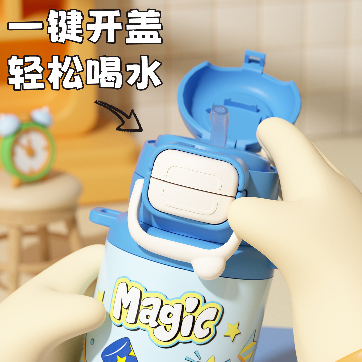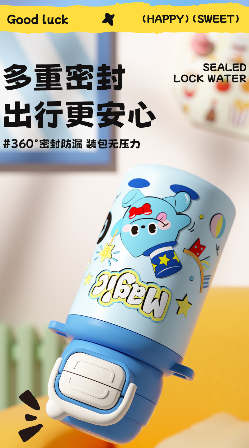 新款双饮儿童保温杯户外大容量运动水壶便携带背带直饮不锈钢水杯