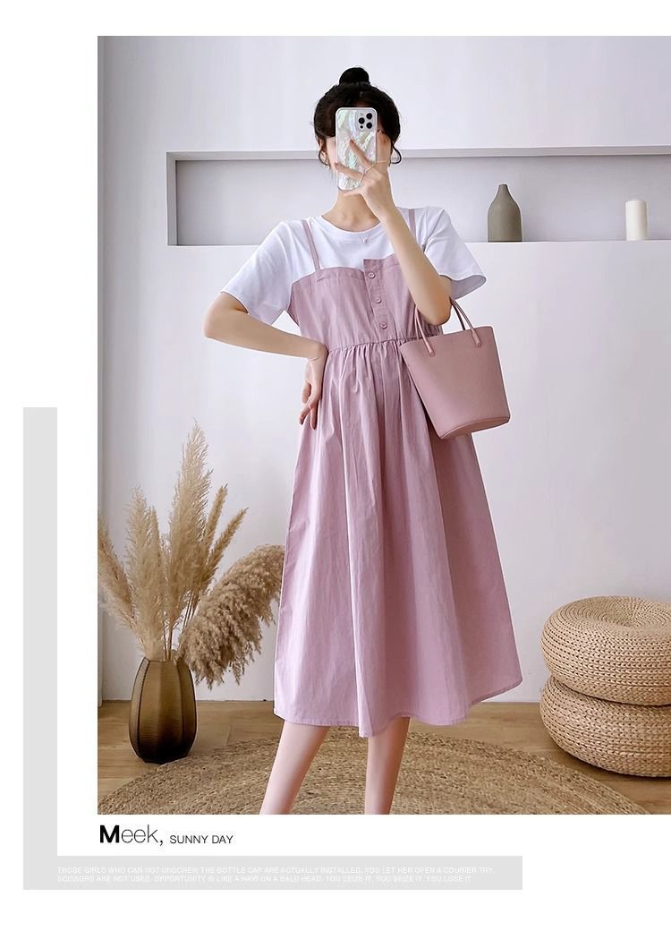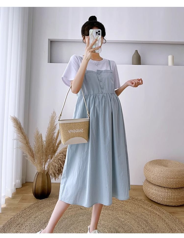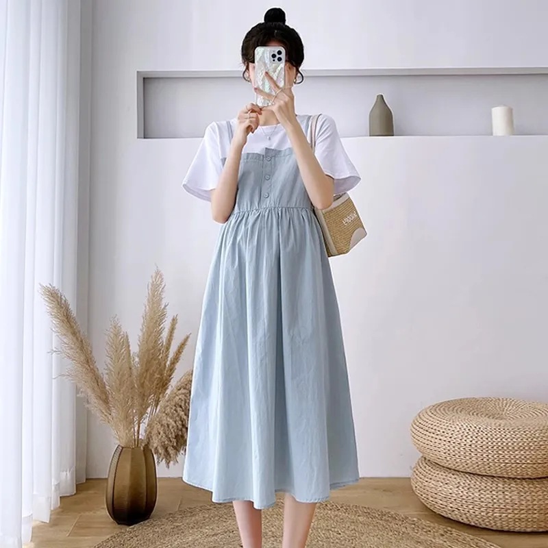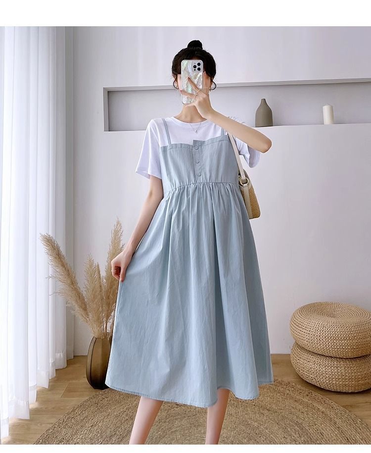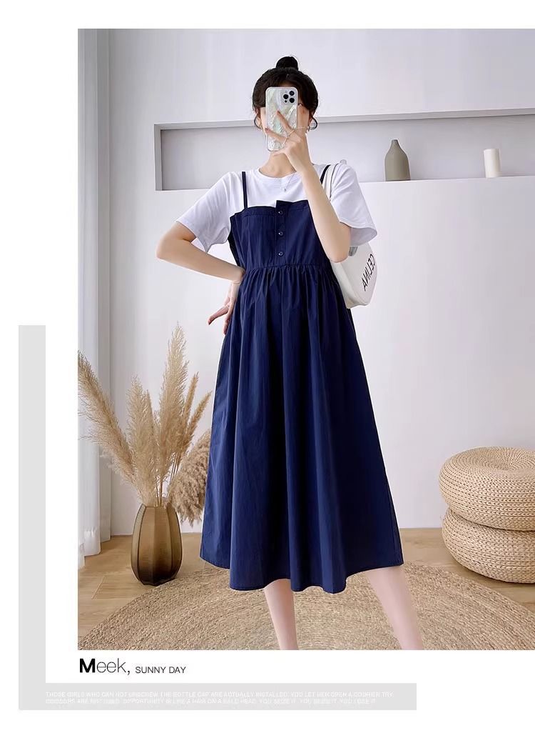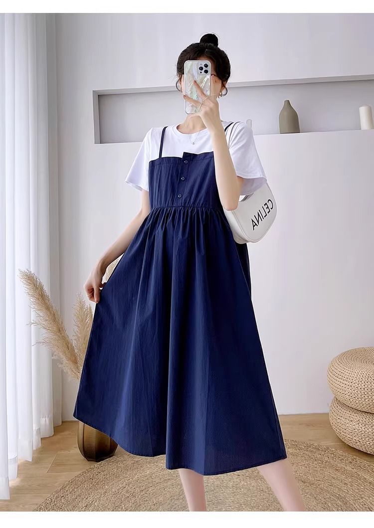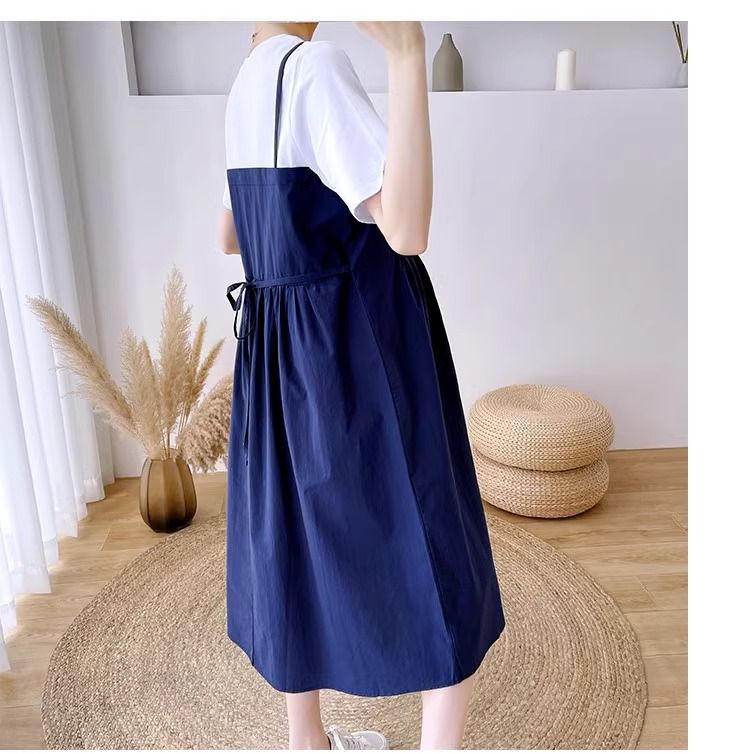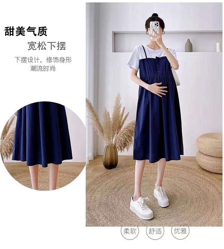 孕妇装新款夏装大码显瘦中长款裙子孕妈拼接假两件宽松遮肚连衣裙