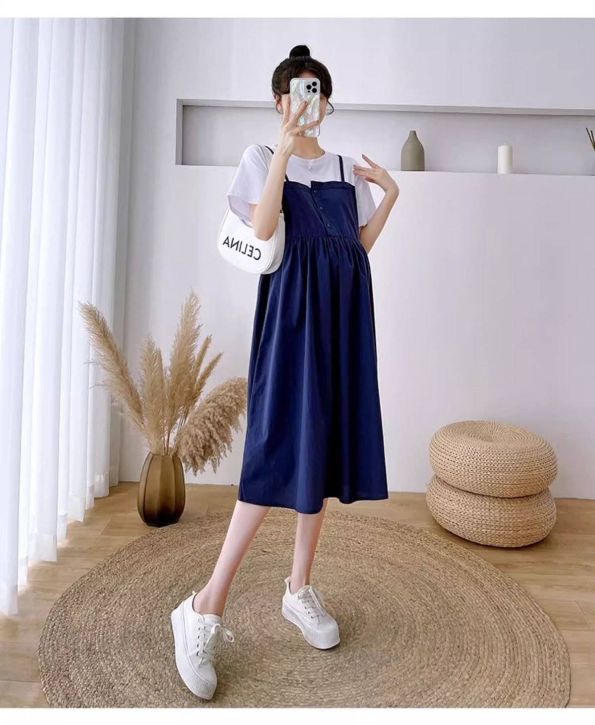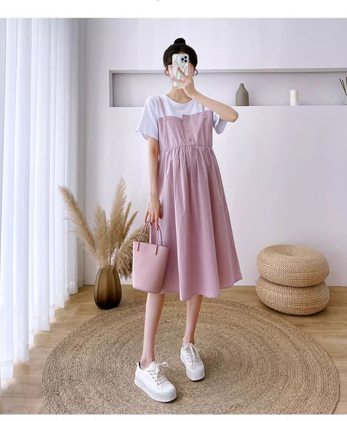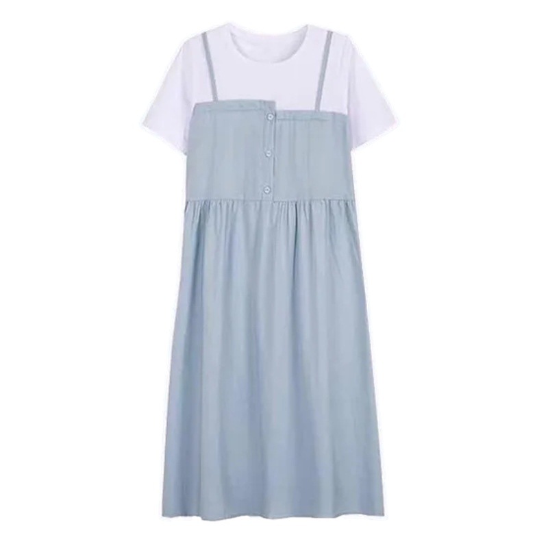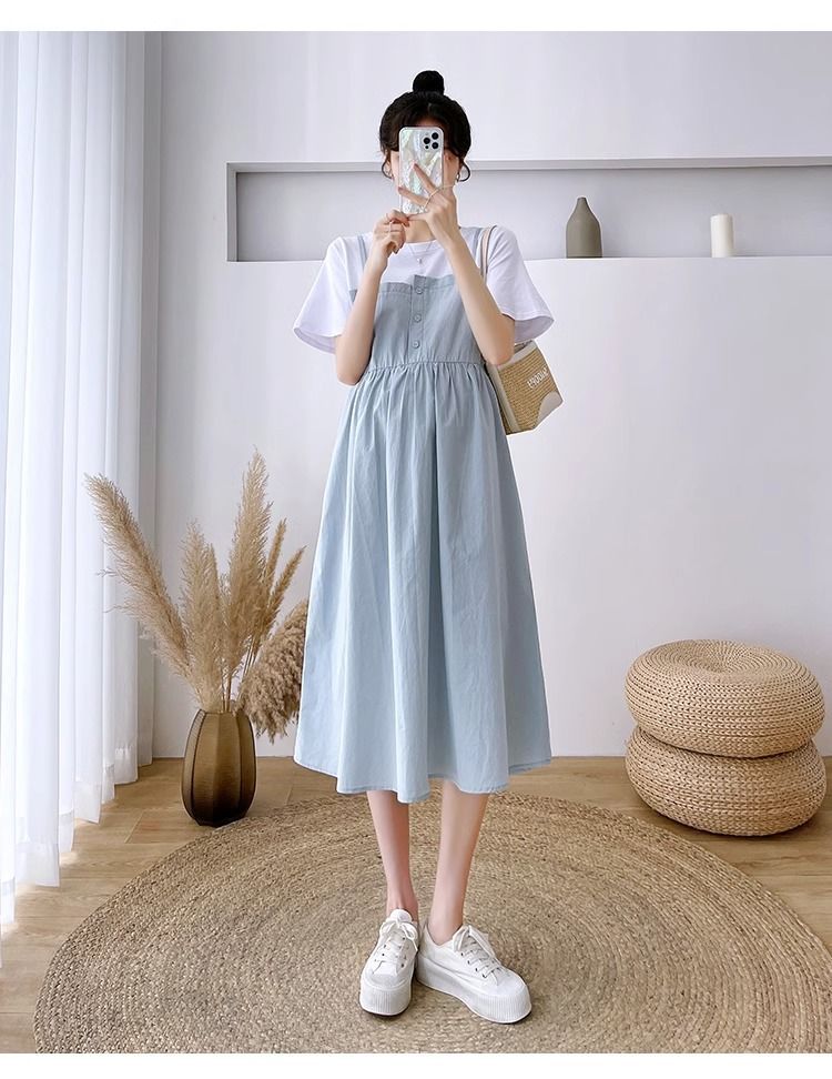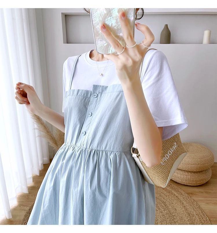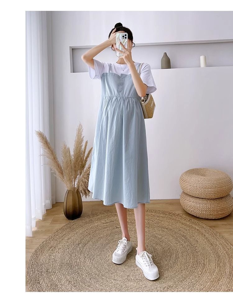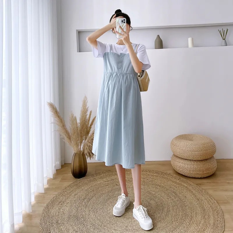 孕妇装新款夏装大码显瘦中长款裙子孕妈拼接假两件宽松遮肚连衣裙