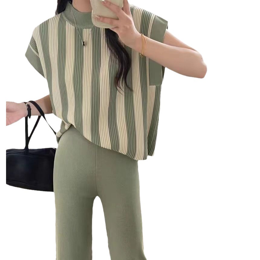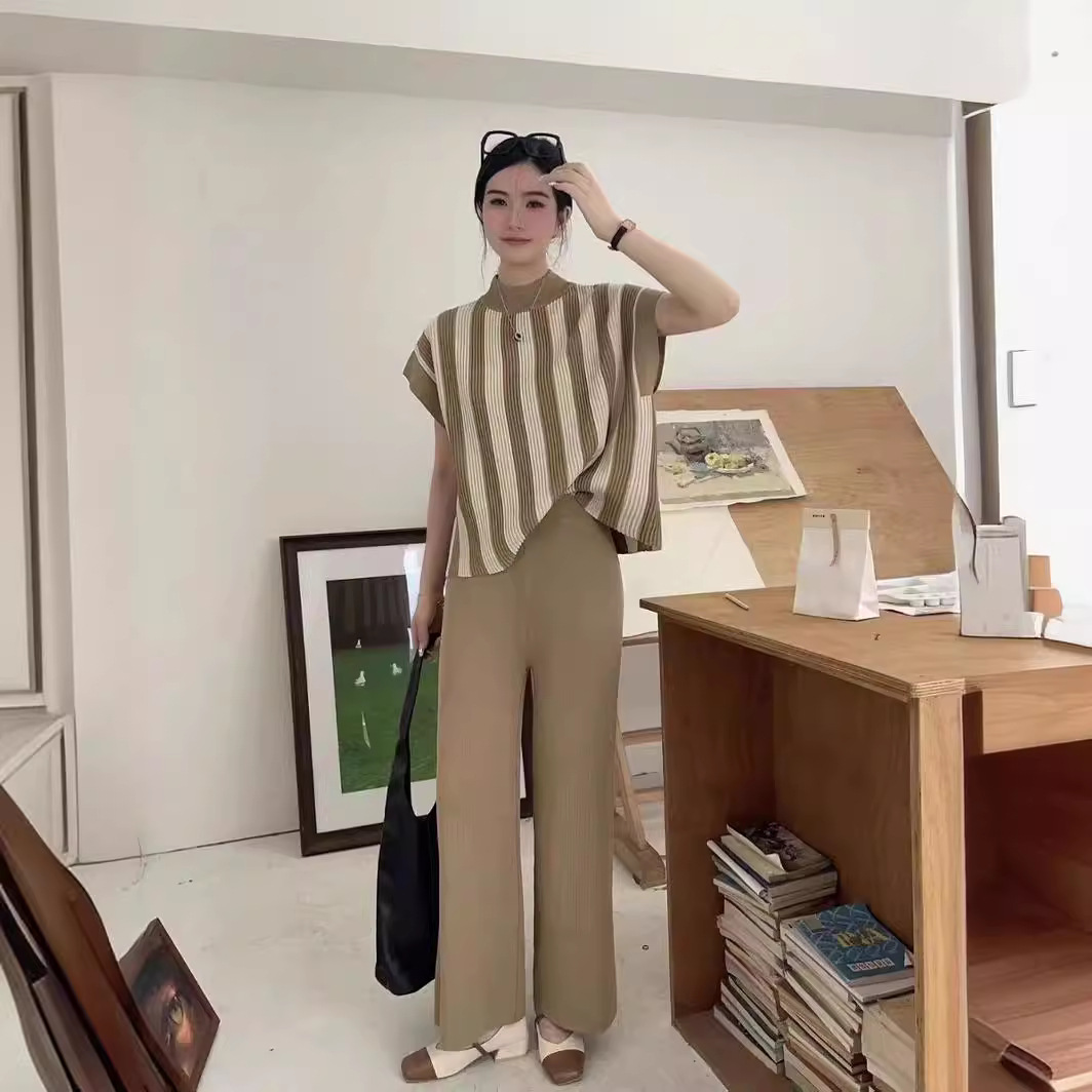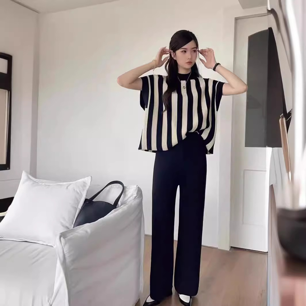 小香风气质名媛针织时尚套装女中领条纹上衣休闲阔腿裤两件套