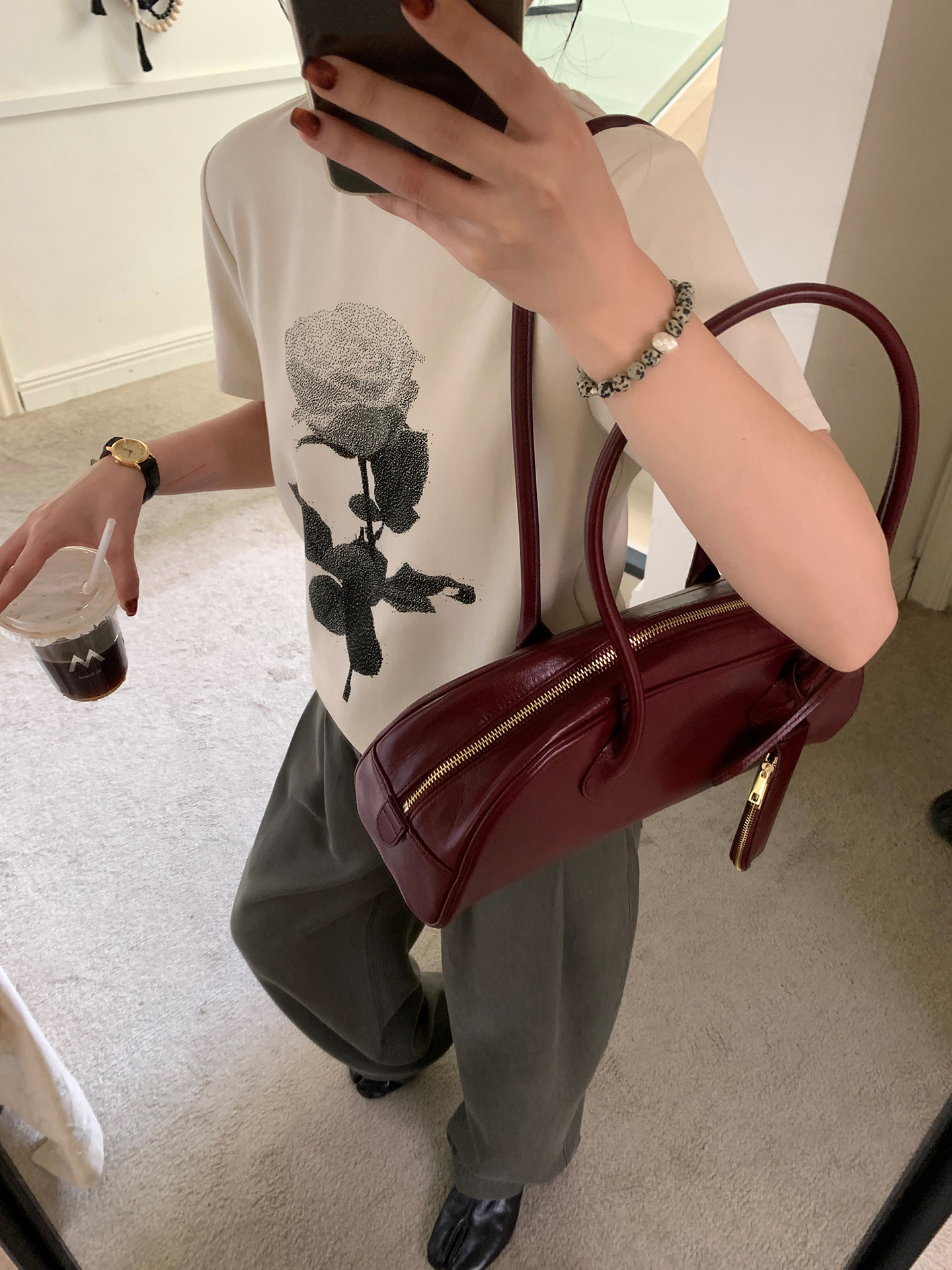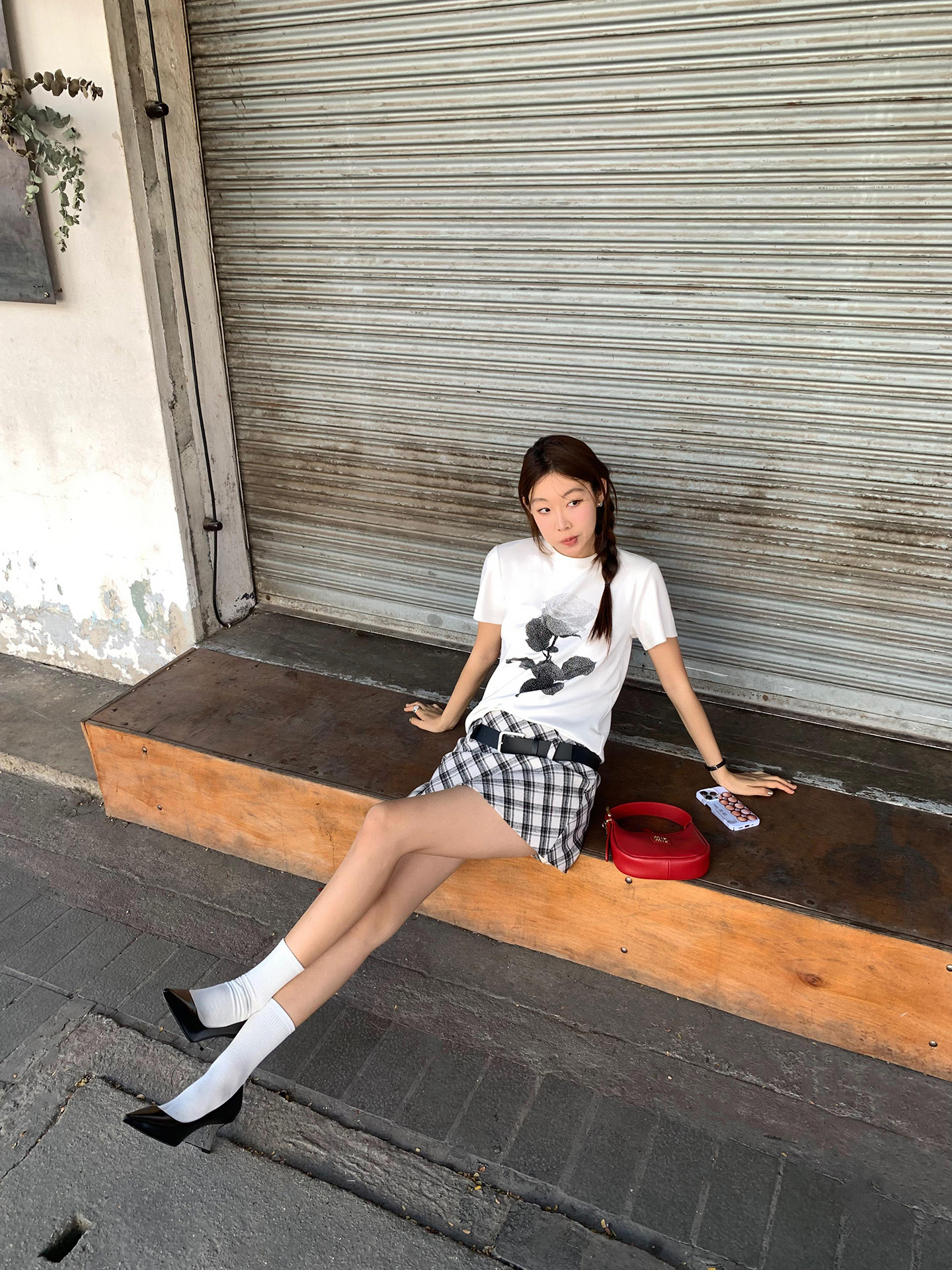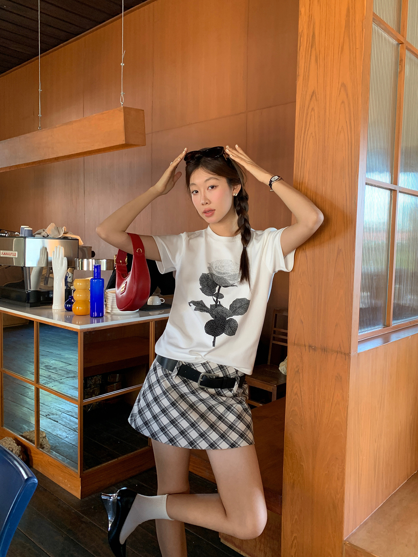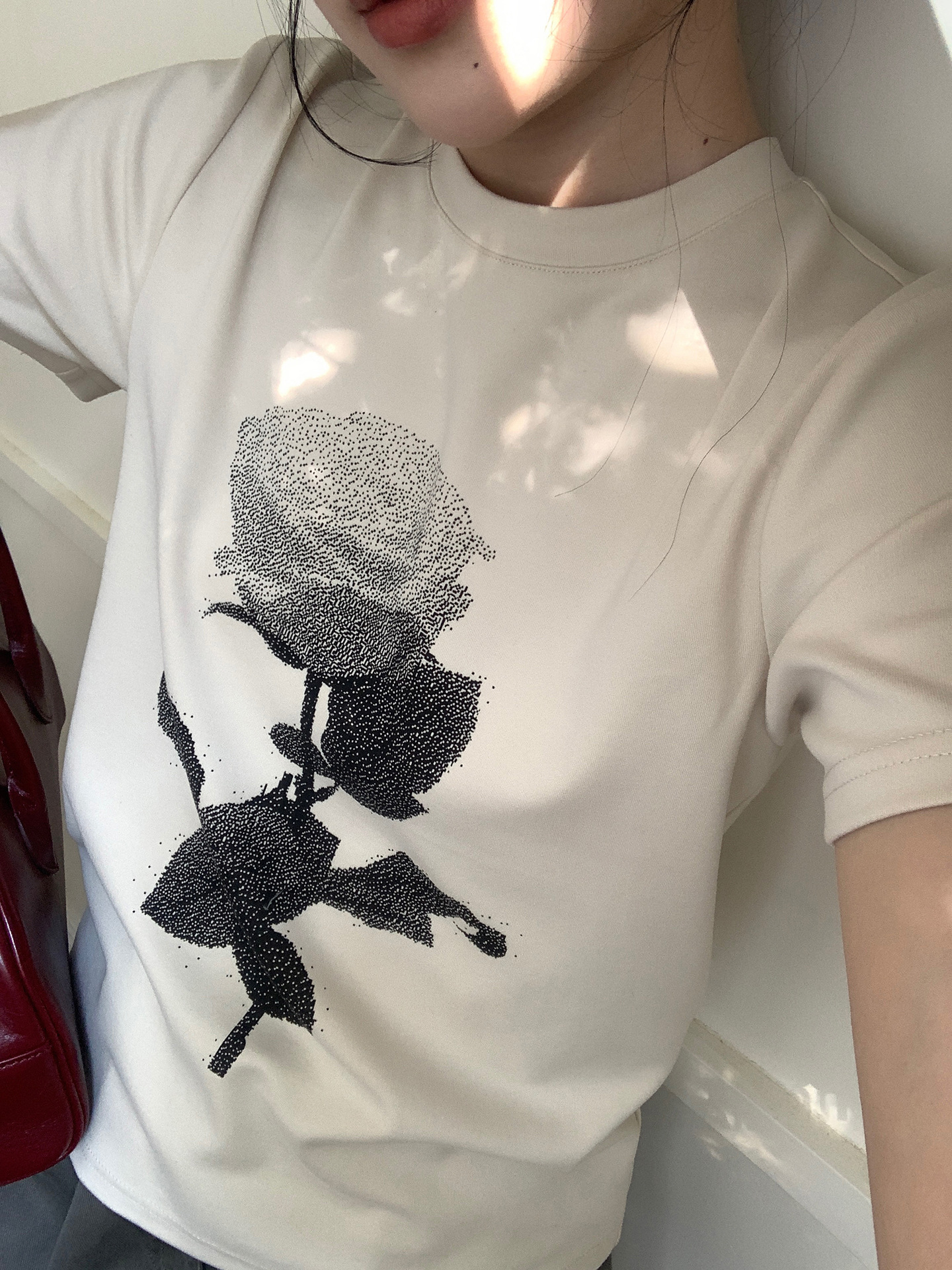 趋梦DT ETOLIE暗黑玫瑰印花圆领短袖T恤女装新款春季正肩上衣