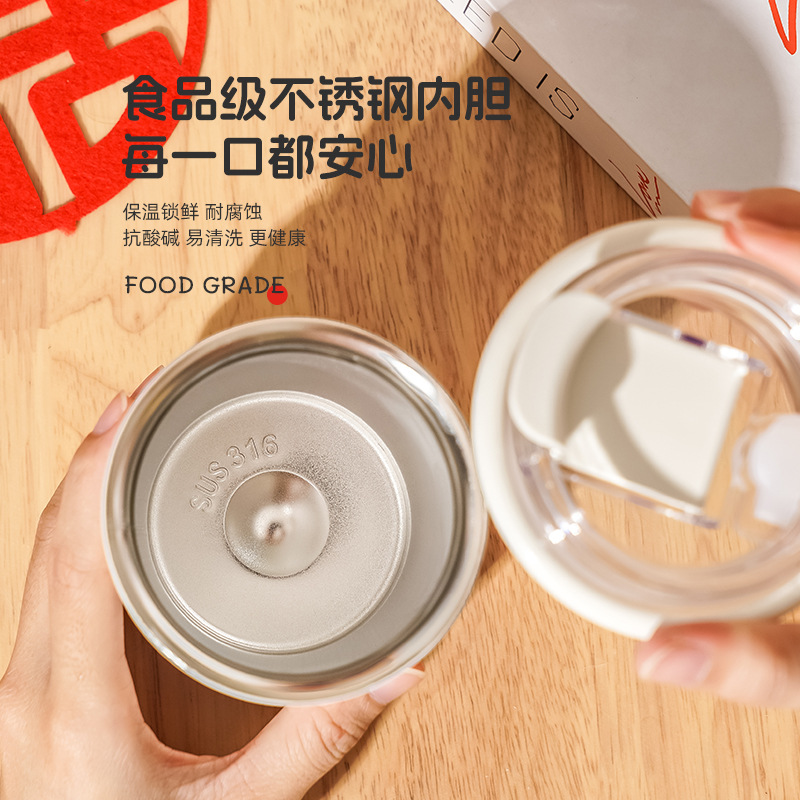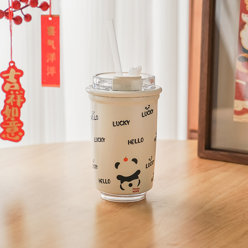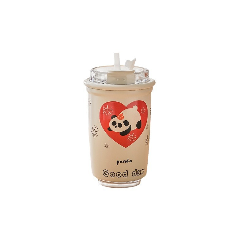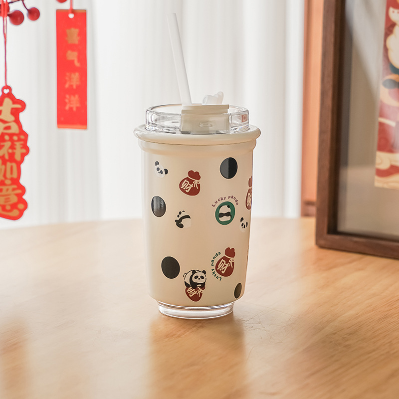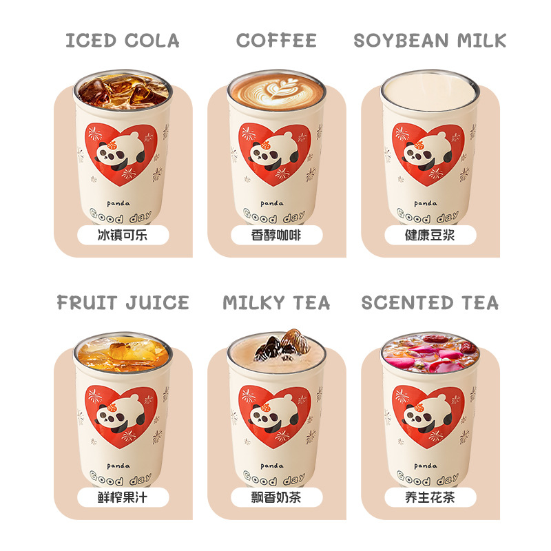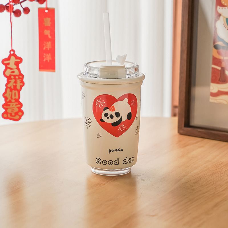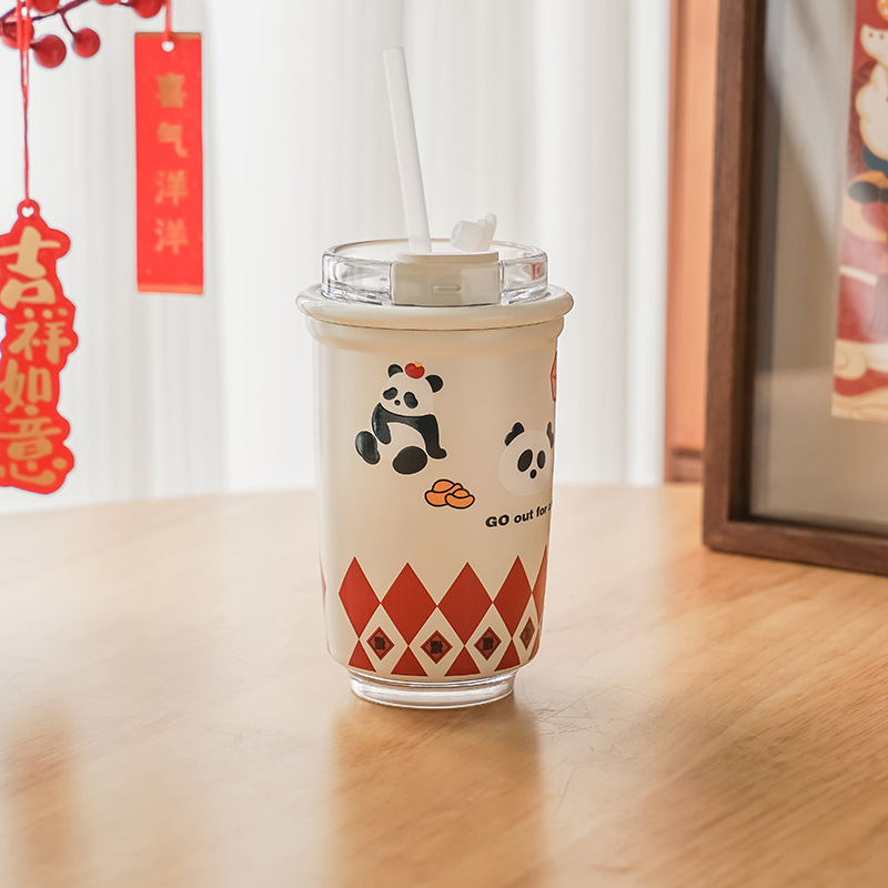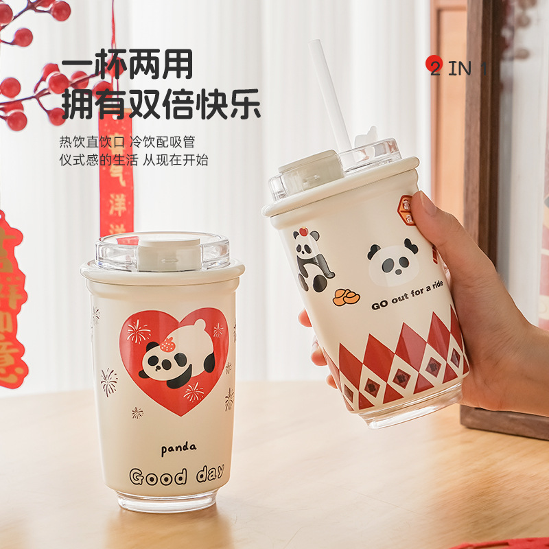新年发财熊猫保温杯创意美式咖啡杯316不锈钢食品级双饮吸管水杯