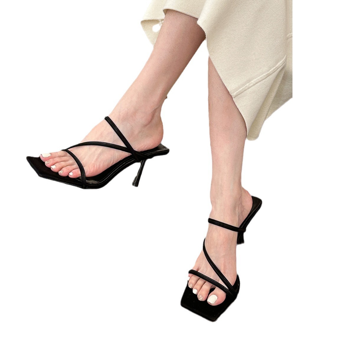 elingstudio 法式高级!米白色一字细带凉鞋女春夏方头细跟高跟鞋