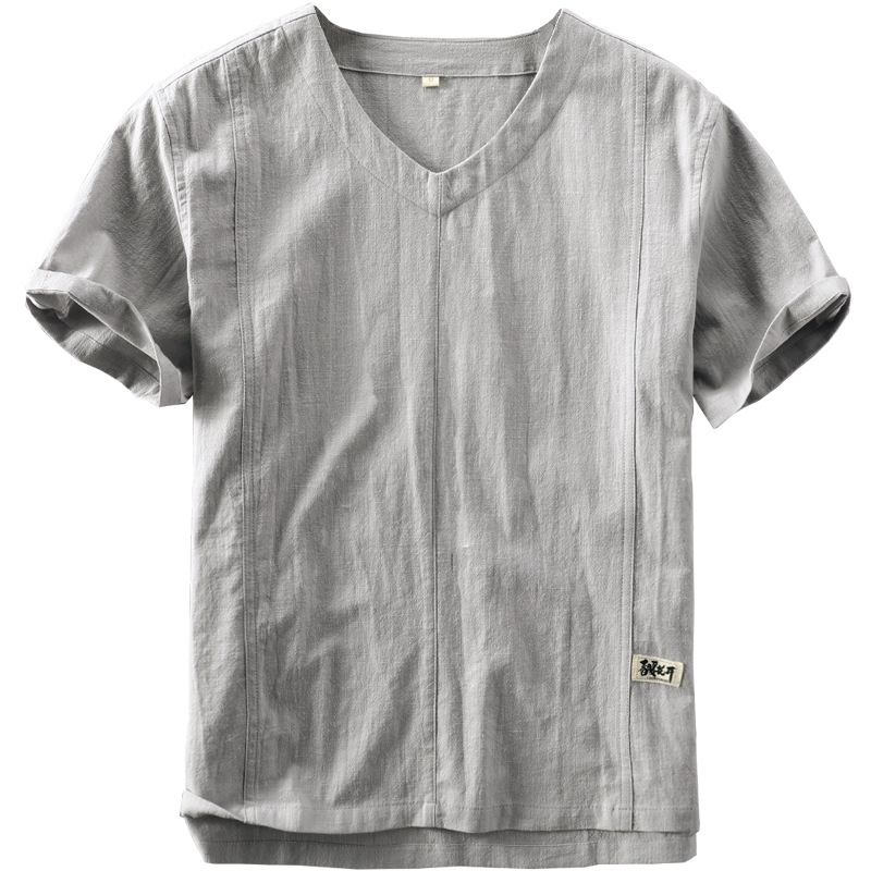 夏季新款亚麻短袖T恤男士简约休闲薄款套头V领棉麻t恤潮