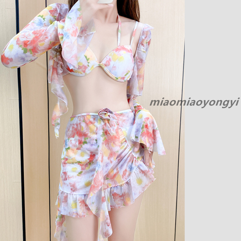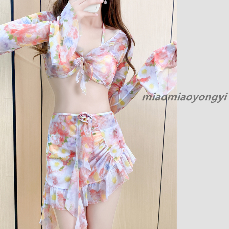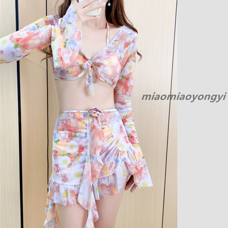 仙气游泳衣女bikini比基尼三件套分体长袖性感温泉度假海边泳装女