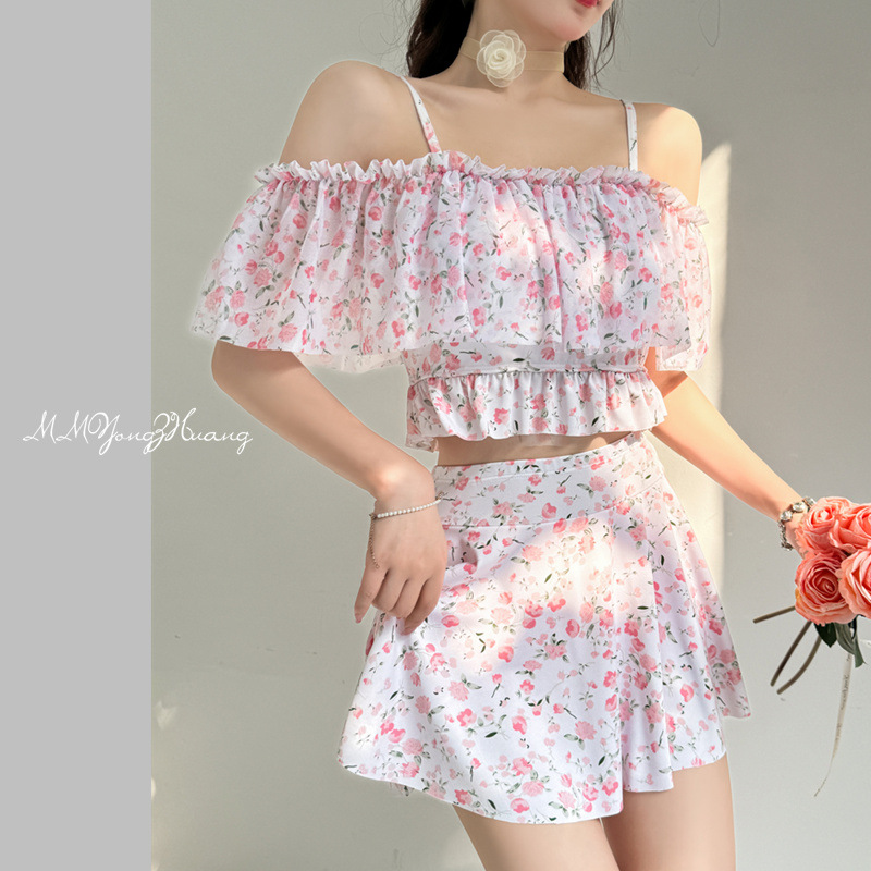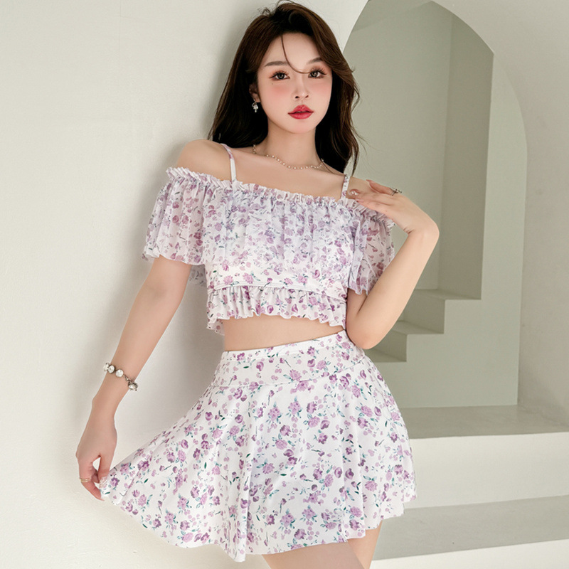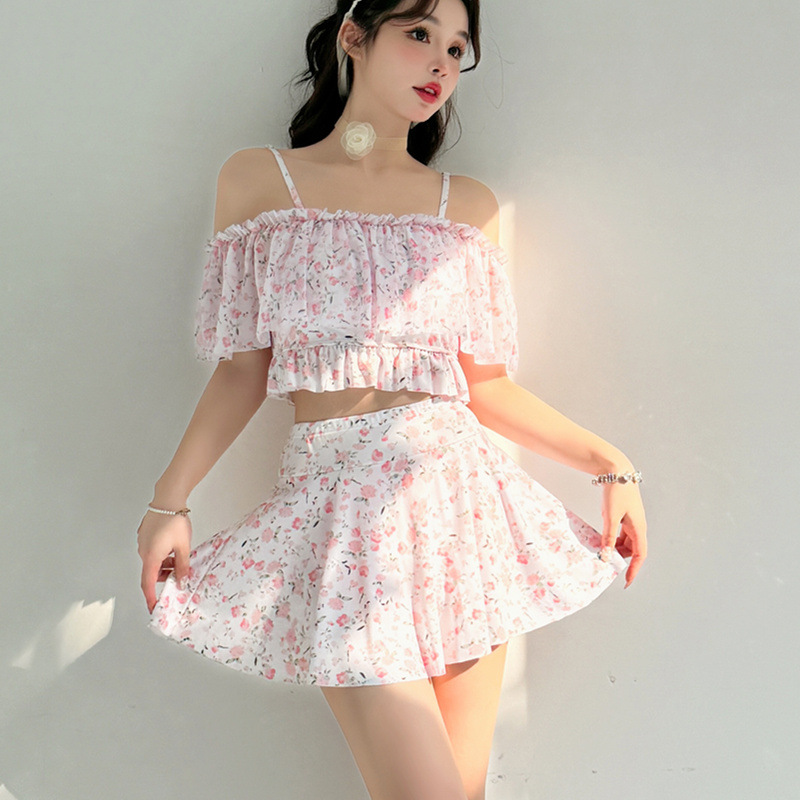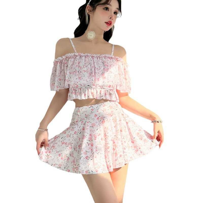 游泳衣女仙气连体荷叶边保守显瘦遮肚温泉少女甜美小清新学生泳装