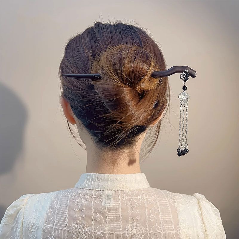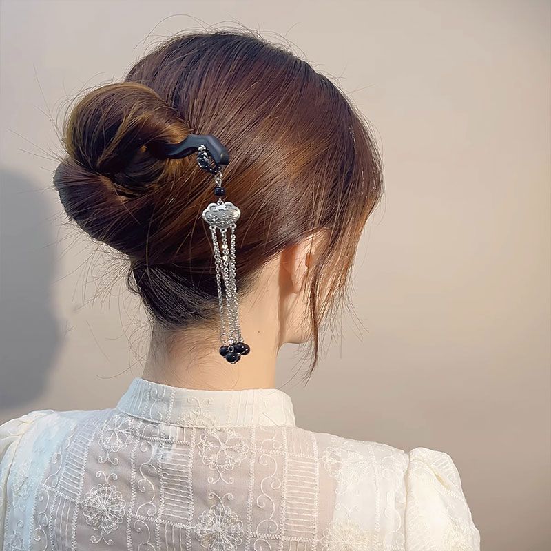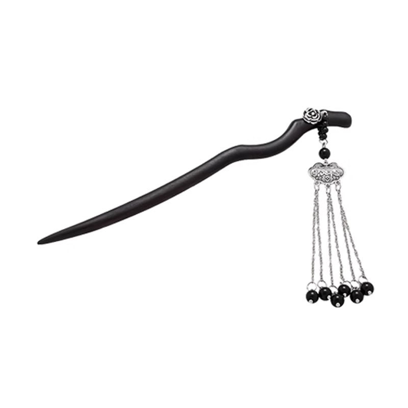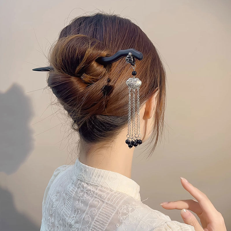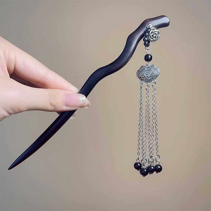 平安富贵锁福木质发簪女中式步摇流苏盘发簪子汉服旗袍古风配饰