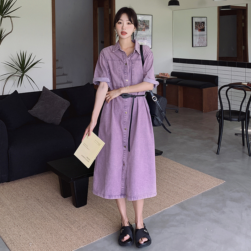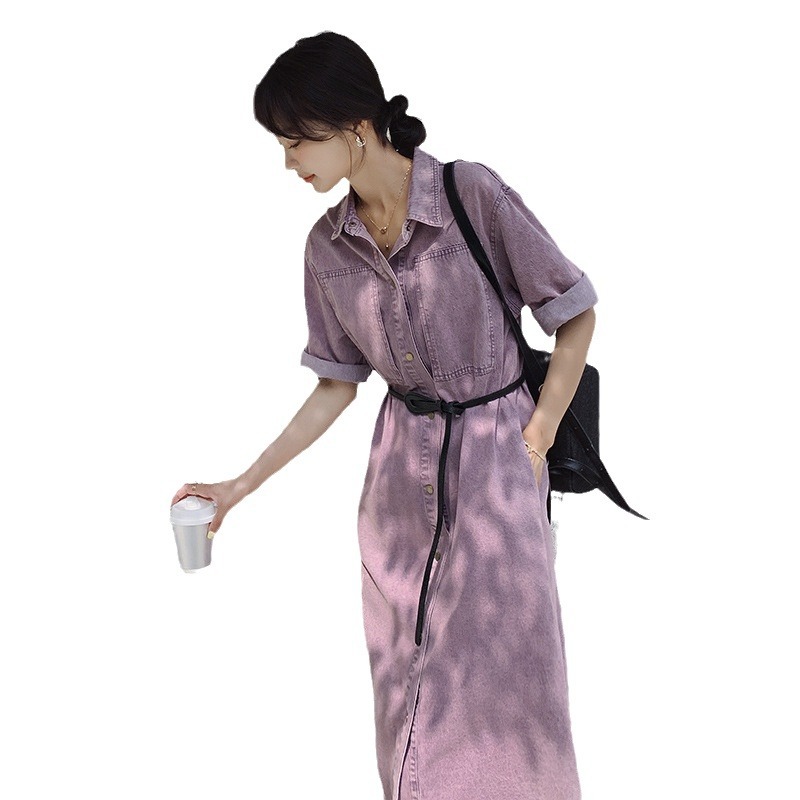 夏款新款法式复古减龄牛仔连衣裙送腰带茶歇法式龄收腰polo领