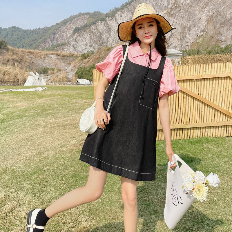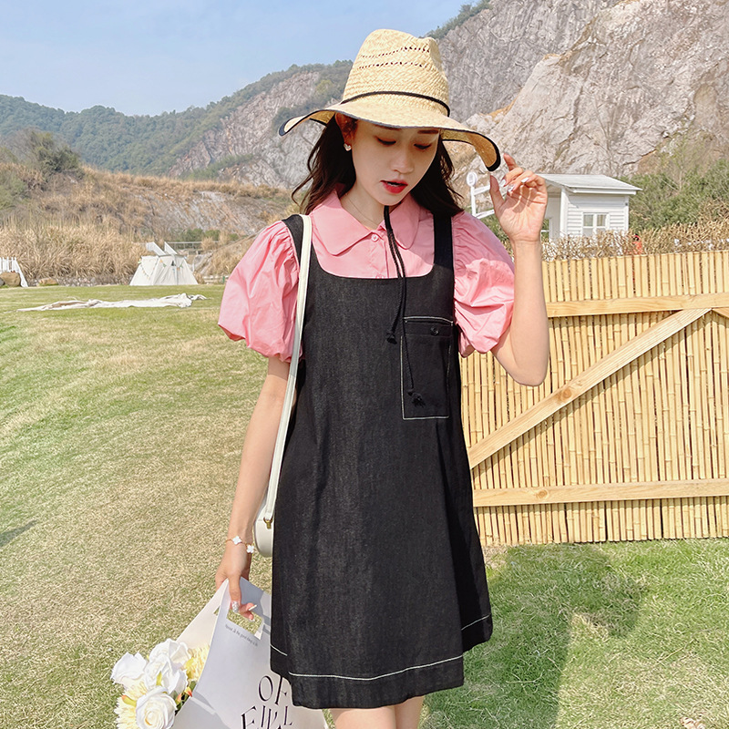 小个子高腰拼接牛仔裙新款女装设计感夏季粉色衬衫牛仔裙俩件套