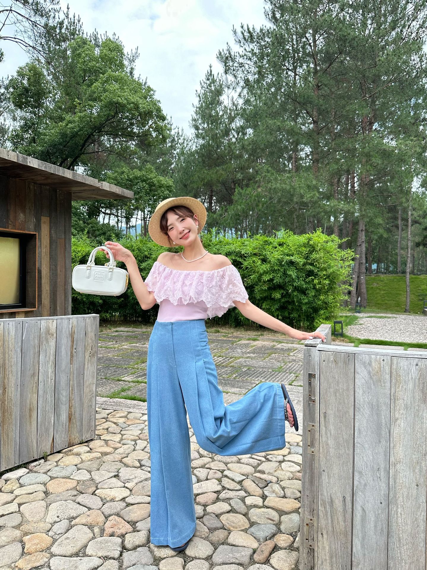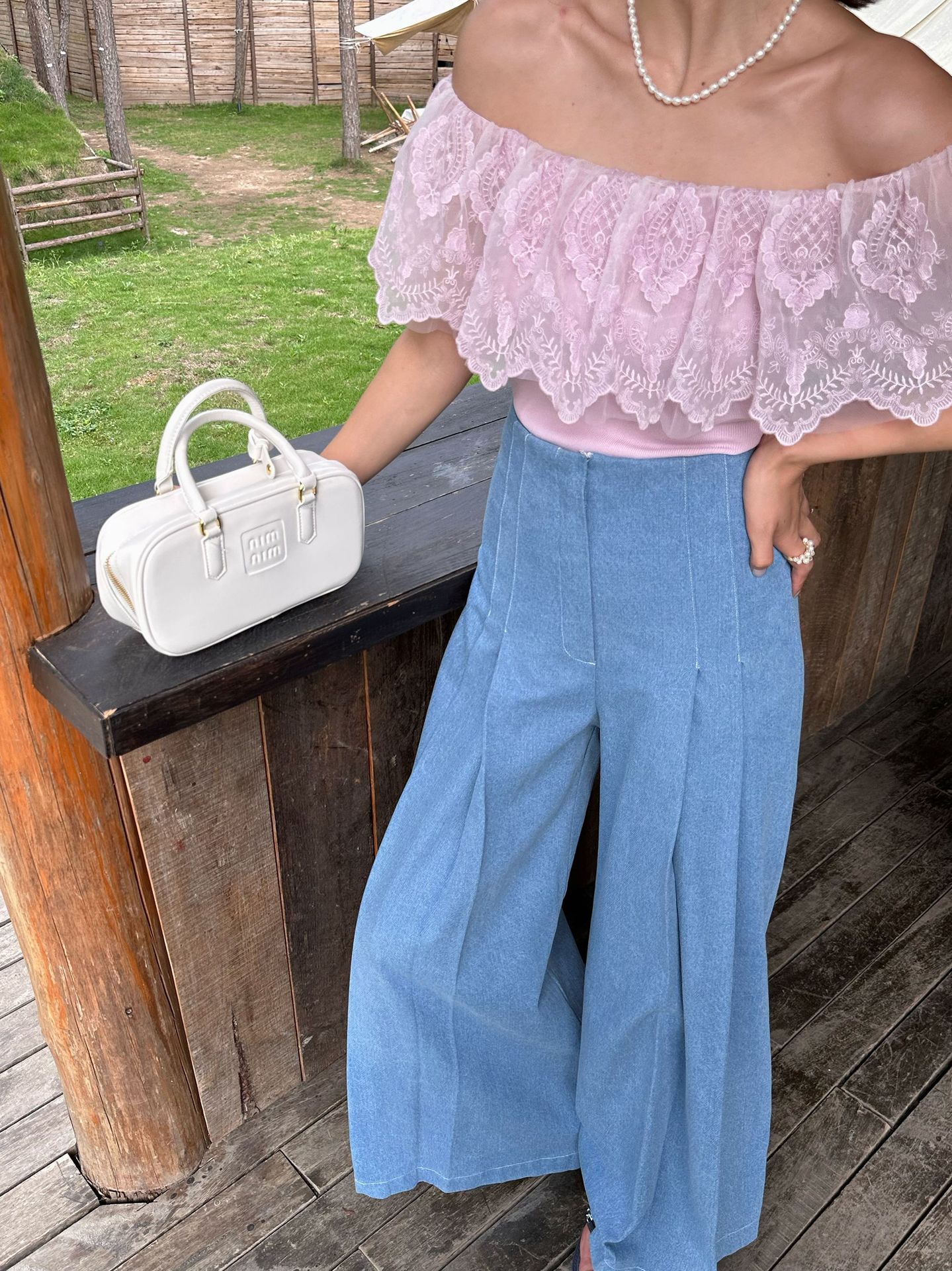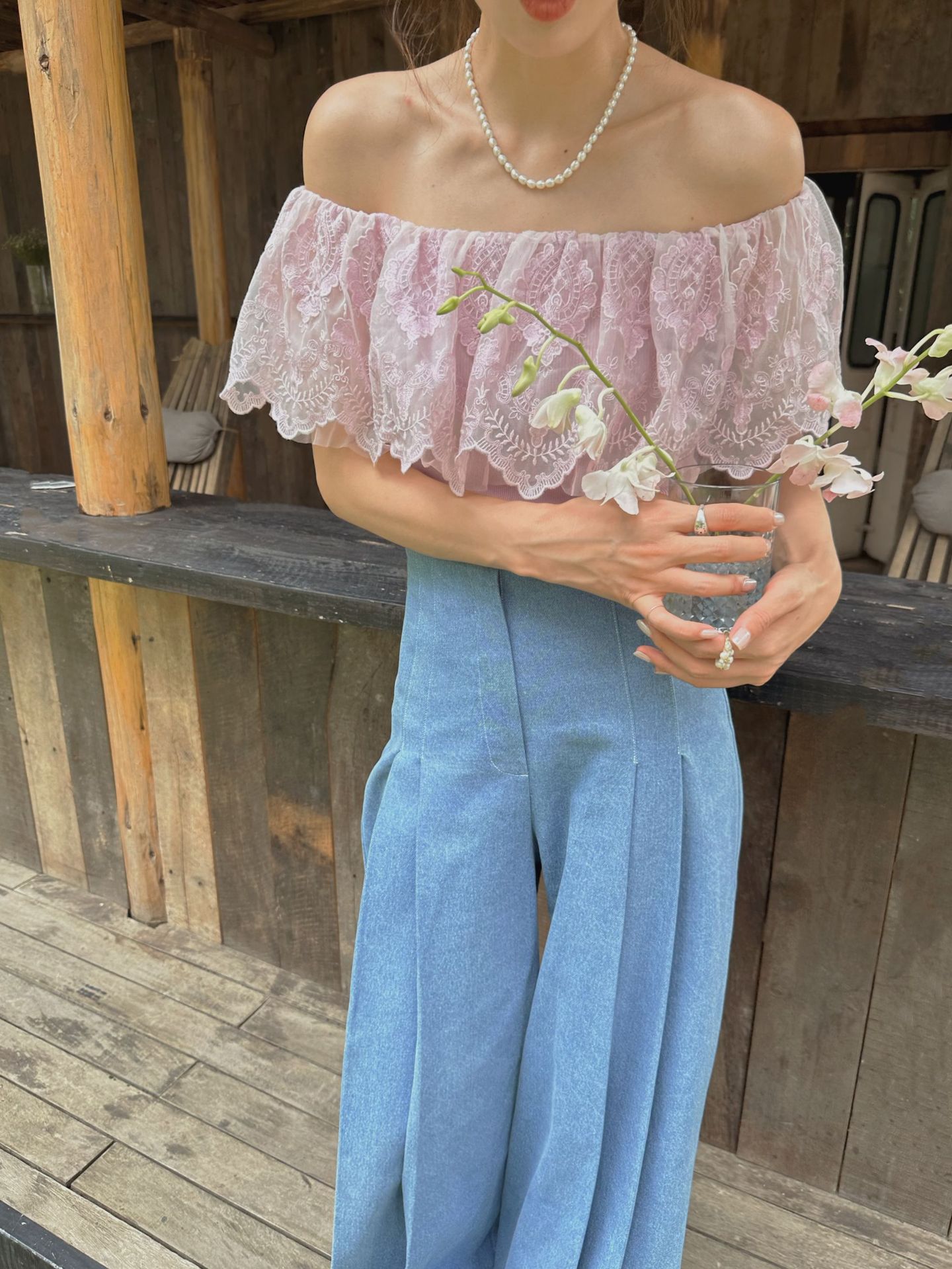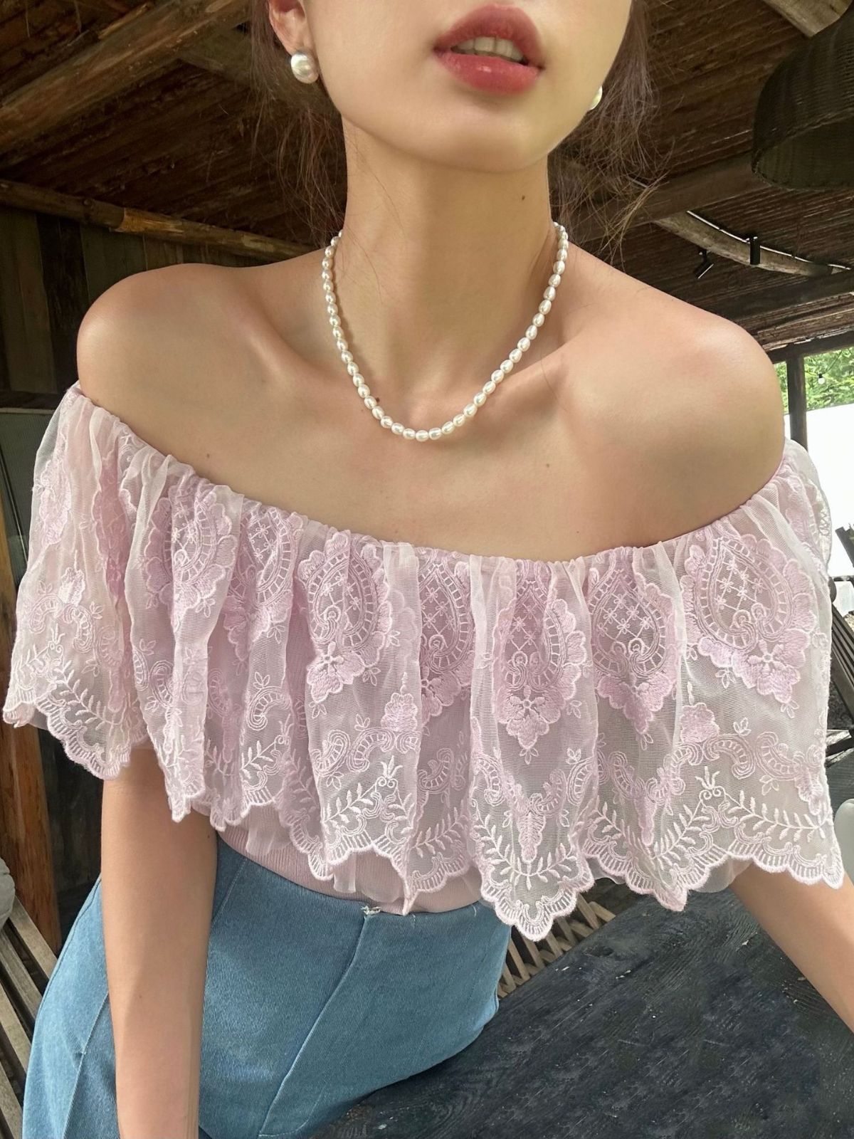 诠释美 NEW OPEN法式甜美一字肩针织衫女夏季蕾丝荷叶边上衣82712