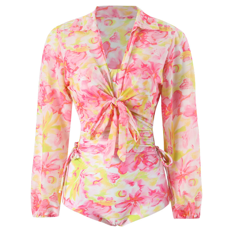轻奢原创简约连体吊带印花泳衣女碎花少女甜美V领外套罩衫泳衣女