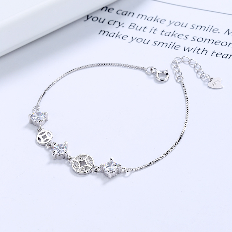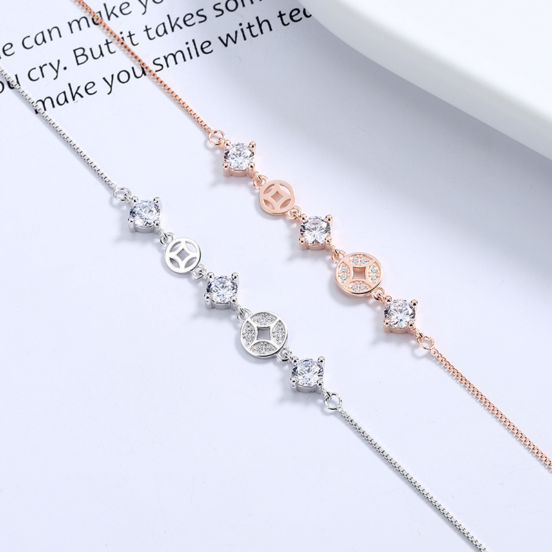 925纯银金铜钱币锆石手链女韩式ins小众设计高级感手饰本命年礼物