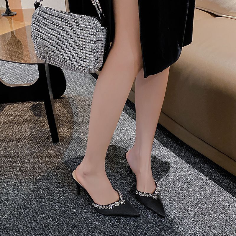 黑色绸缎尖头水钻高跟鞋年新款百搭网红性感细跟包头凉拖鞋女
