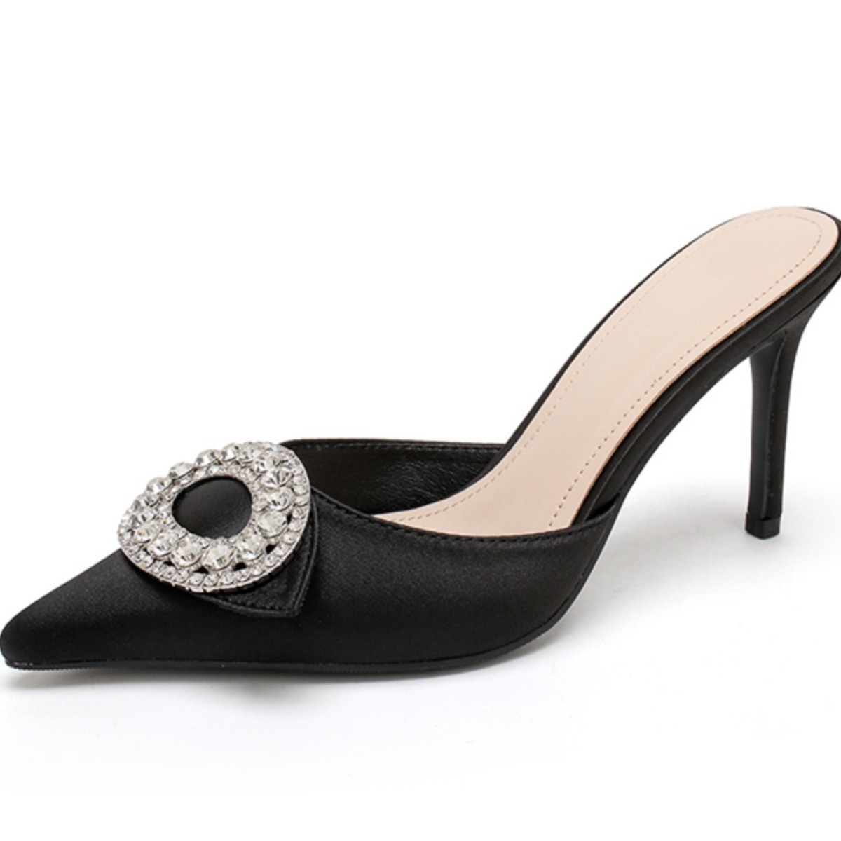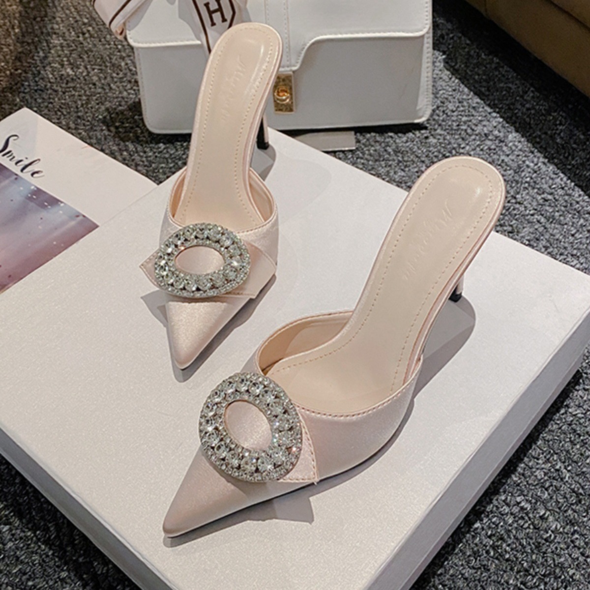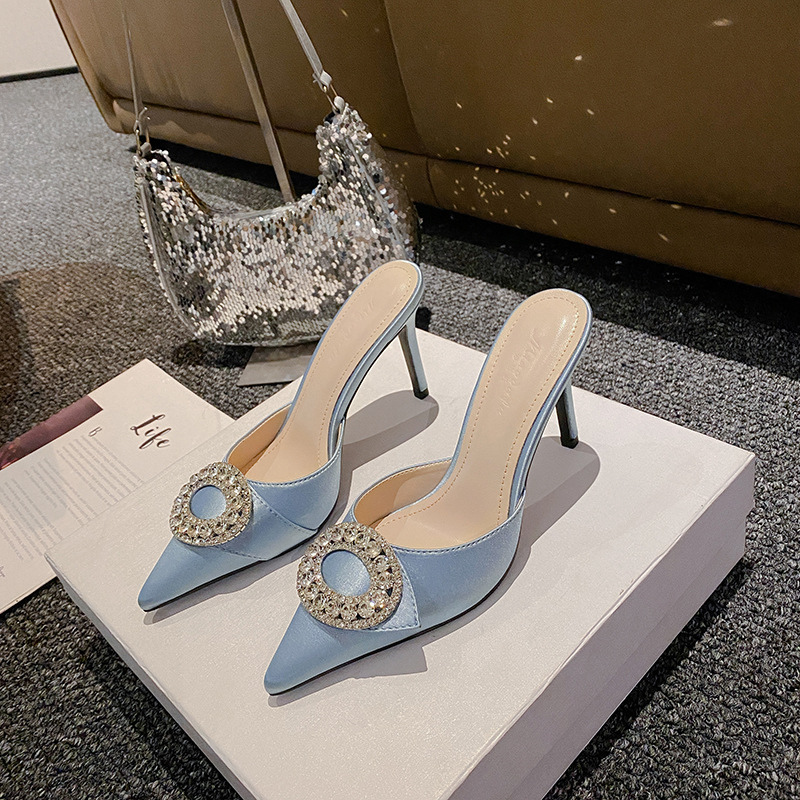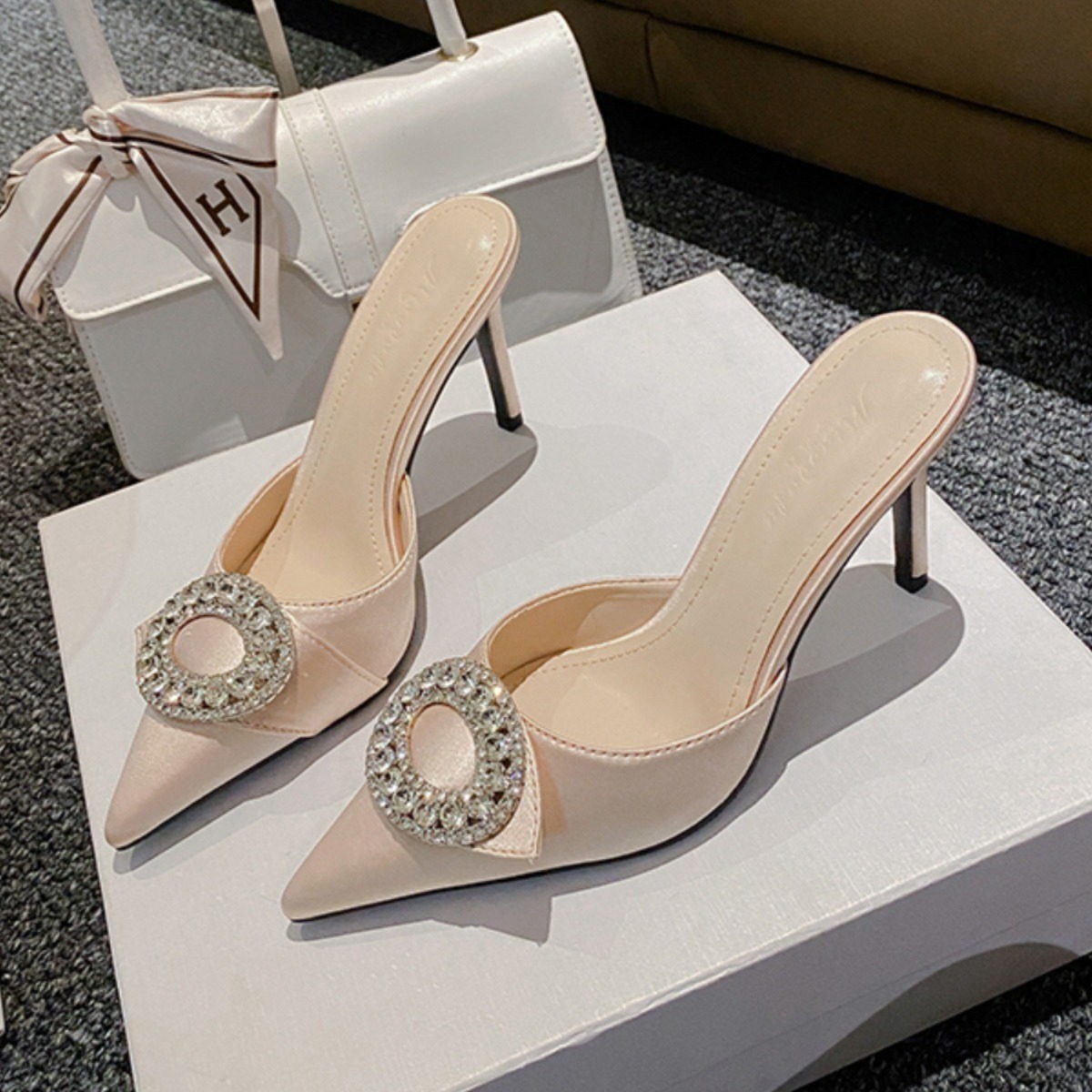 高跟半拖鞋年新款百搭尖头水钻扣细跟凉鞋网红仙女风包头拖女