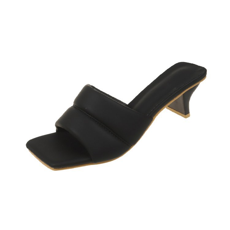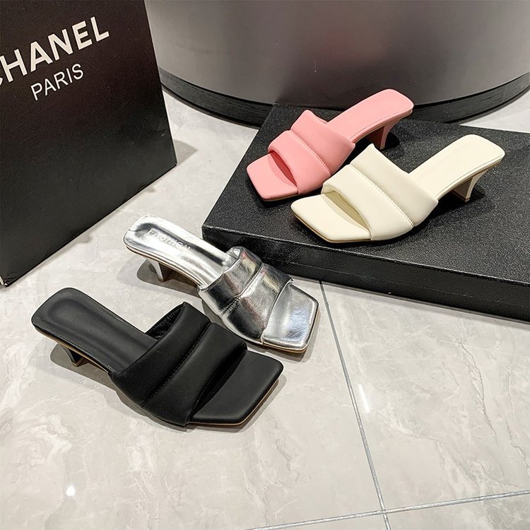 夏季新款粗跟凉拖鞋女外穿方头露趾一字高跟鞋时尚女鞋