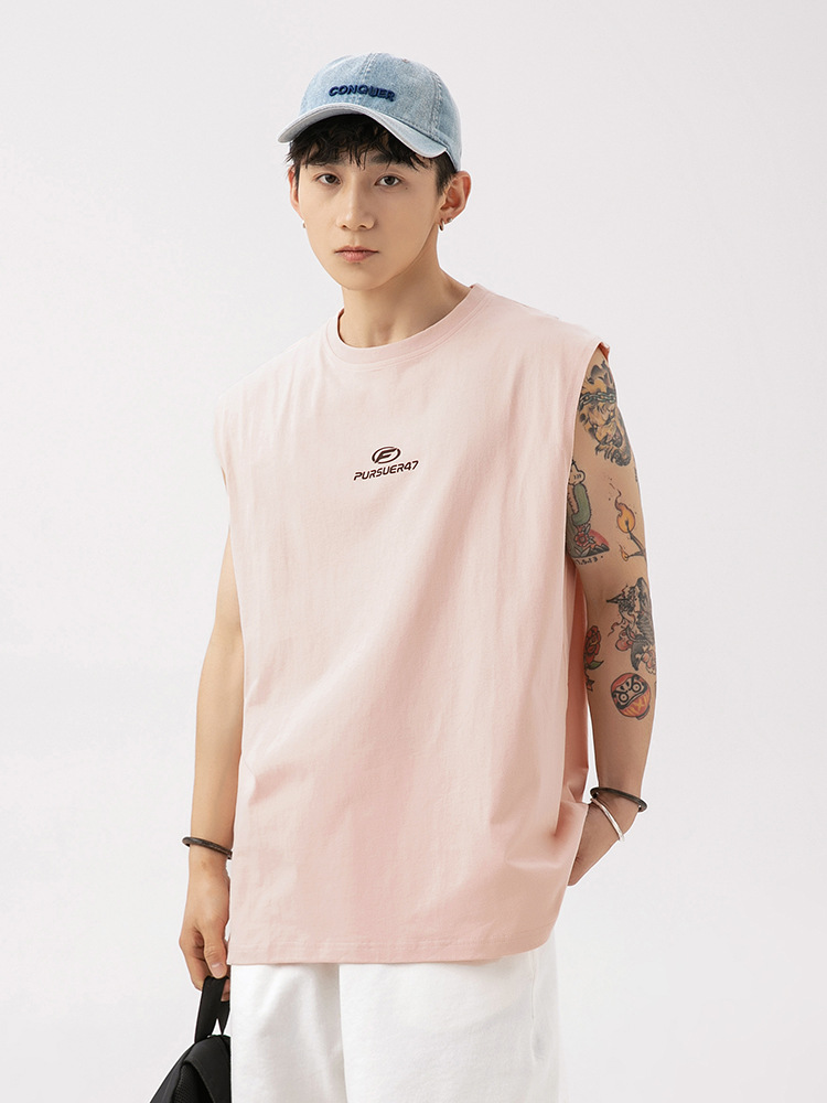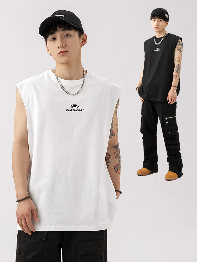 美式复古无袖T恤男夏季款纯棉落肩背心宽松休闲字母印花坎肩