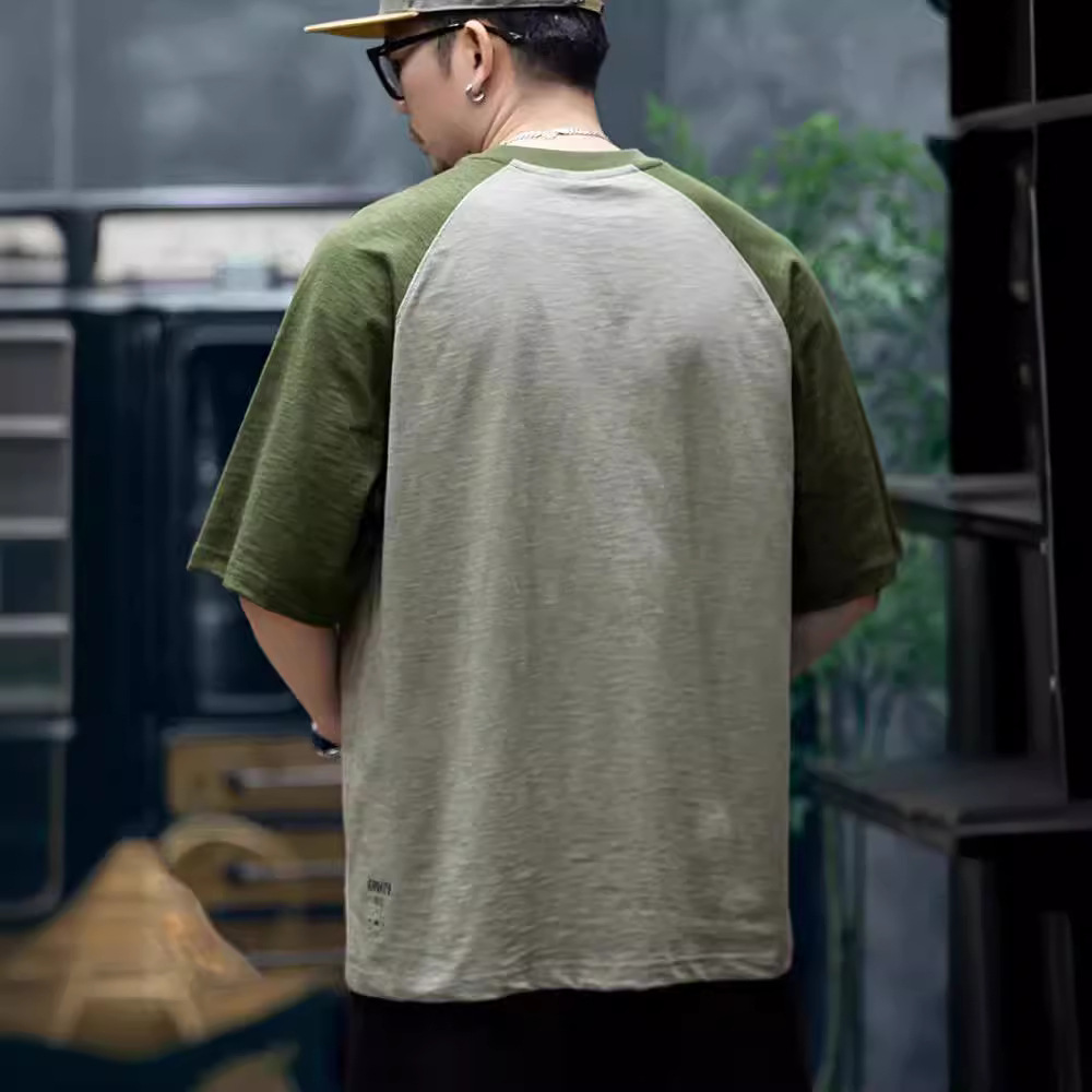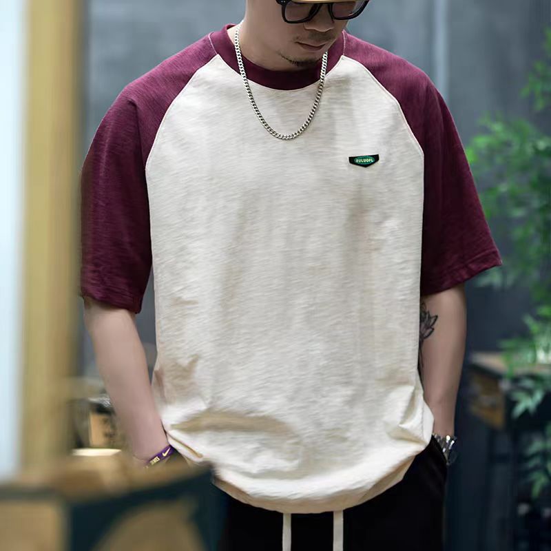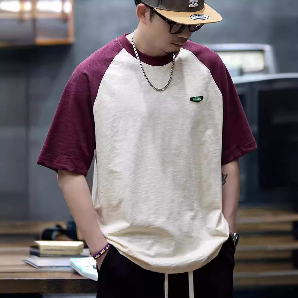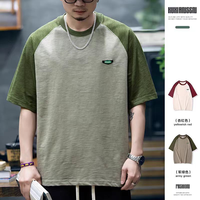 竹节棉短袖t恤男夏季250g重磅异色拼接圆领半袖男士宽松休闲T恤衫