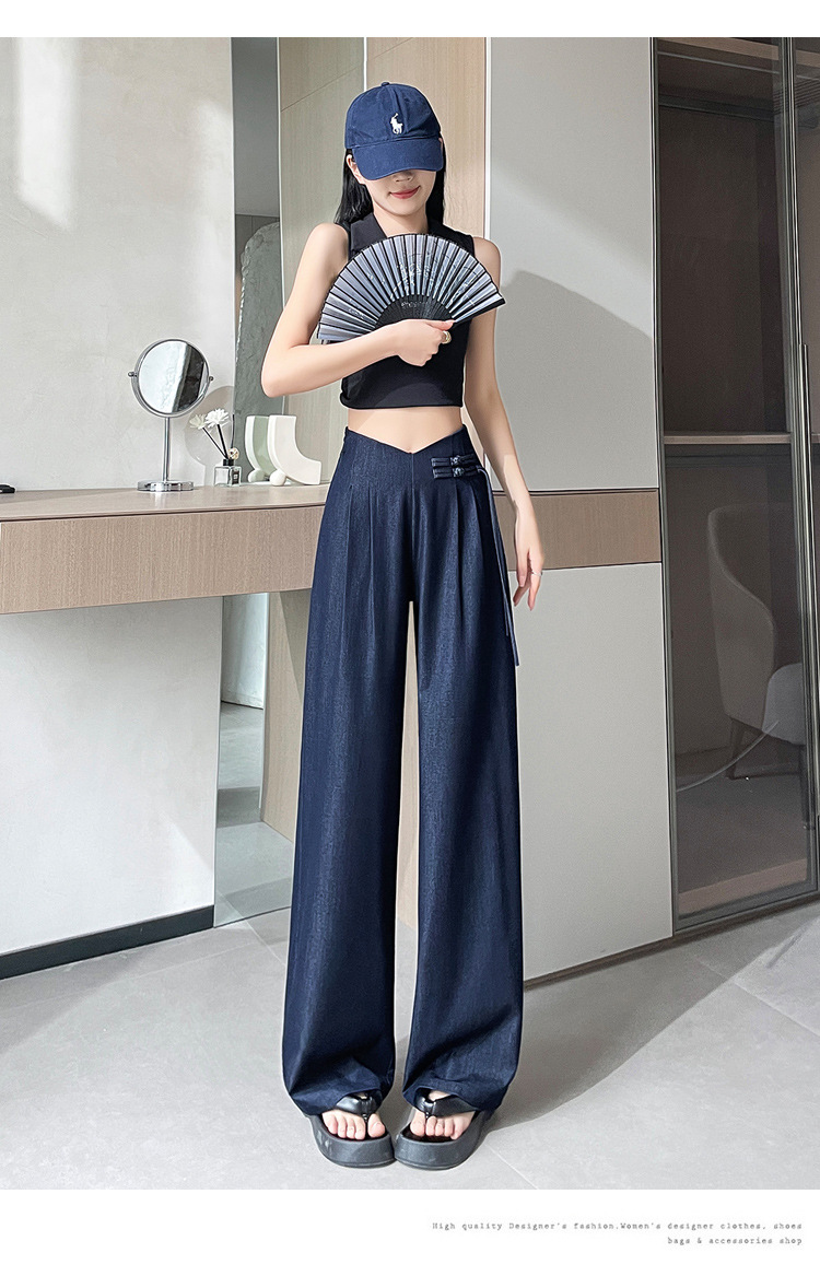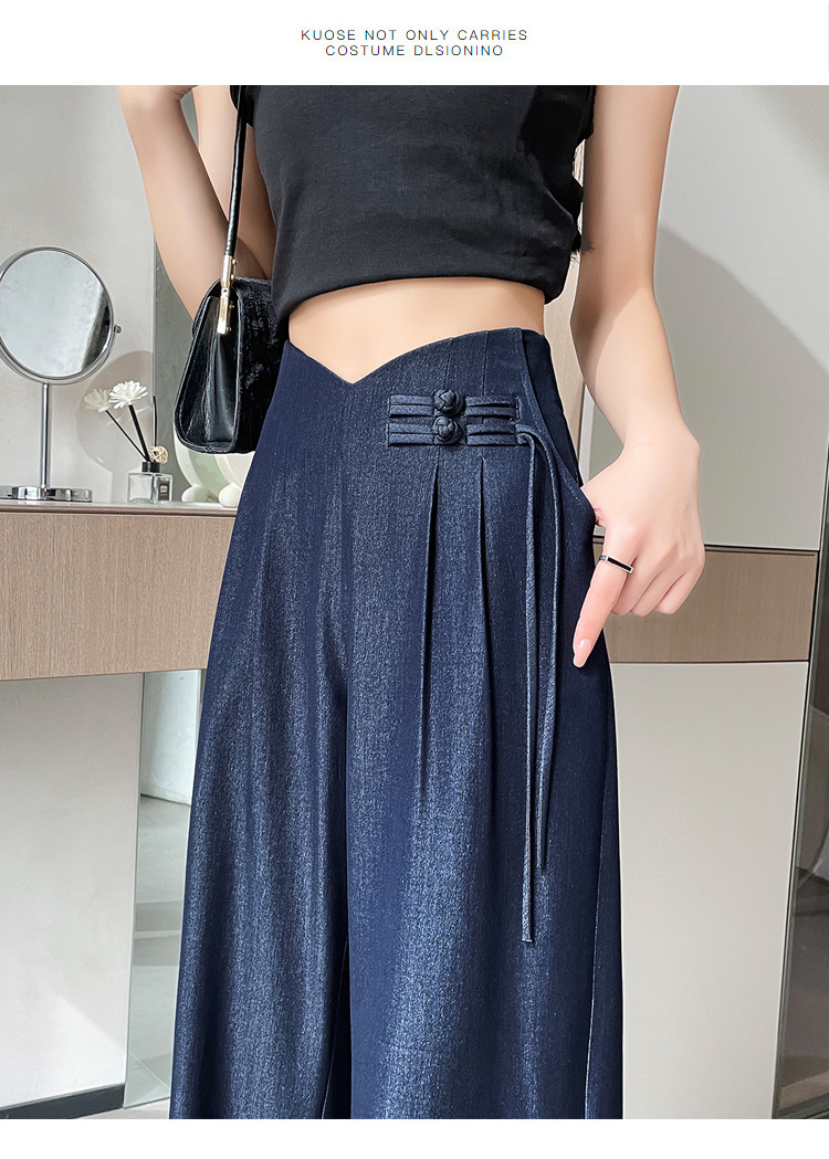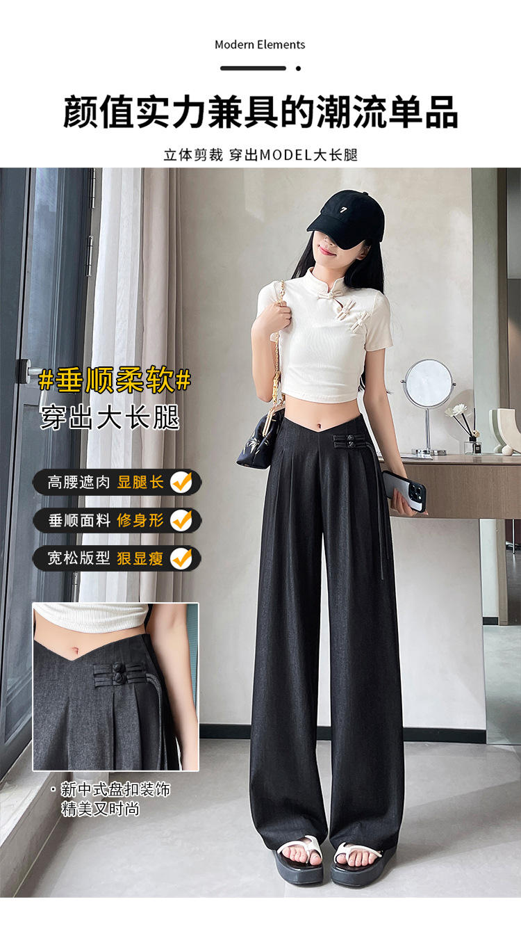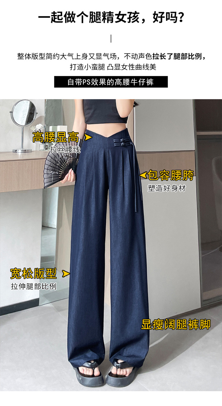 新中式天丝牛仔裤女夏季薄款高腰垂感国风盘扣窄版直筒西装阔腿裤