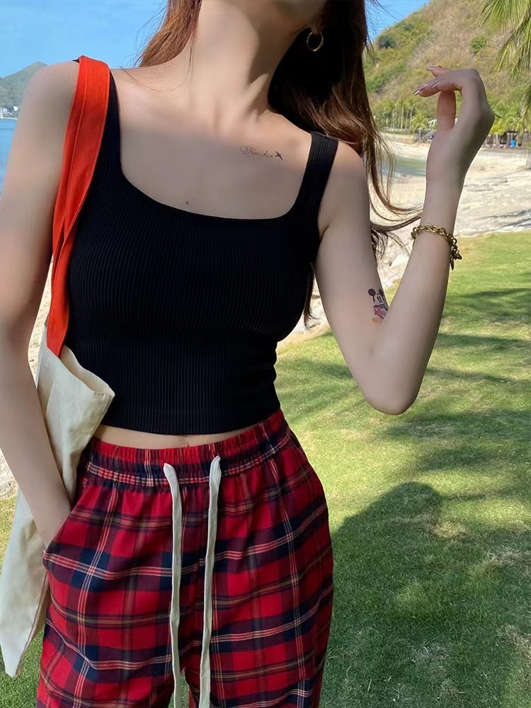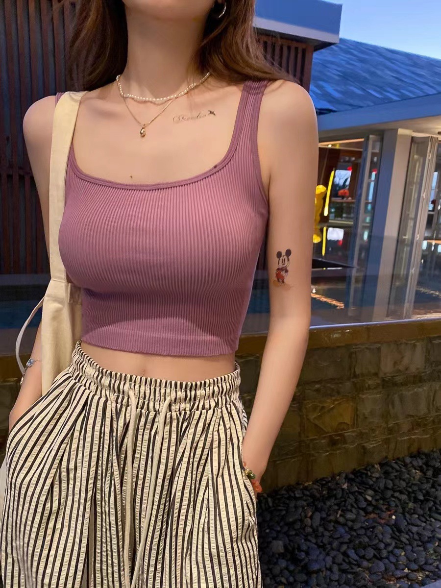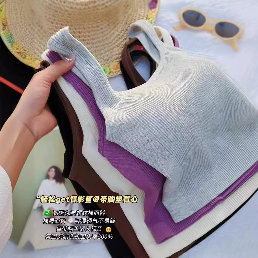 方领吊带背心女外穿夏季新款带胸垫一体文胸内搭白色短款打底上衣