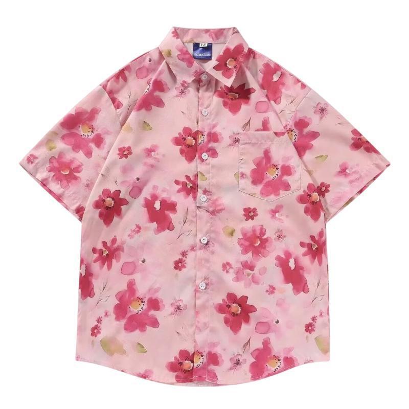 设计感油画满印沙滩衬衣男生潮牌休闲vintage宽松夏季短袖花衬衫
